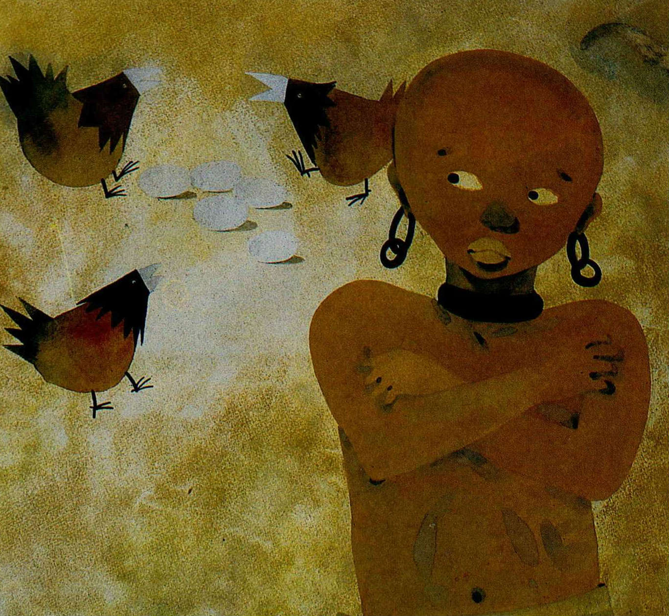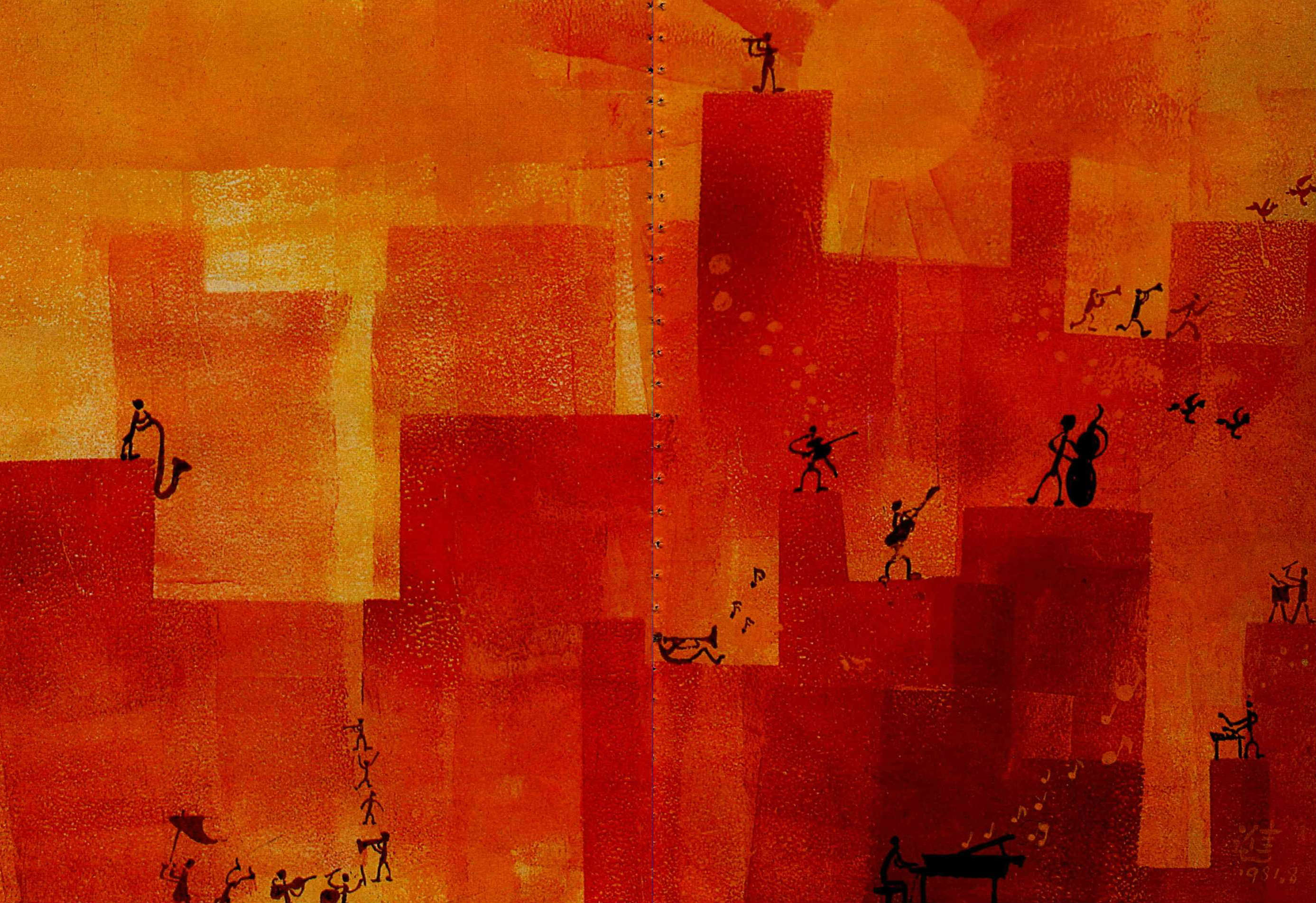 鄭明進一九八一年作品,紙版畫「屋頂上的音樂家」。