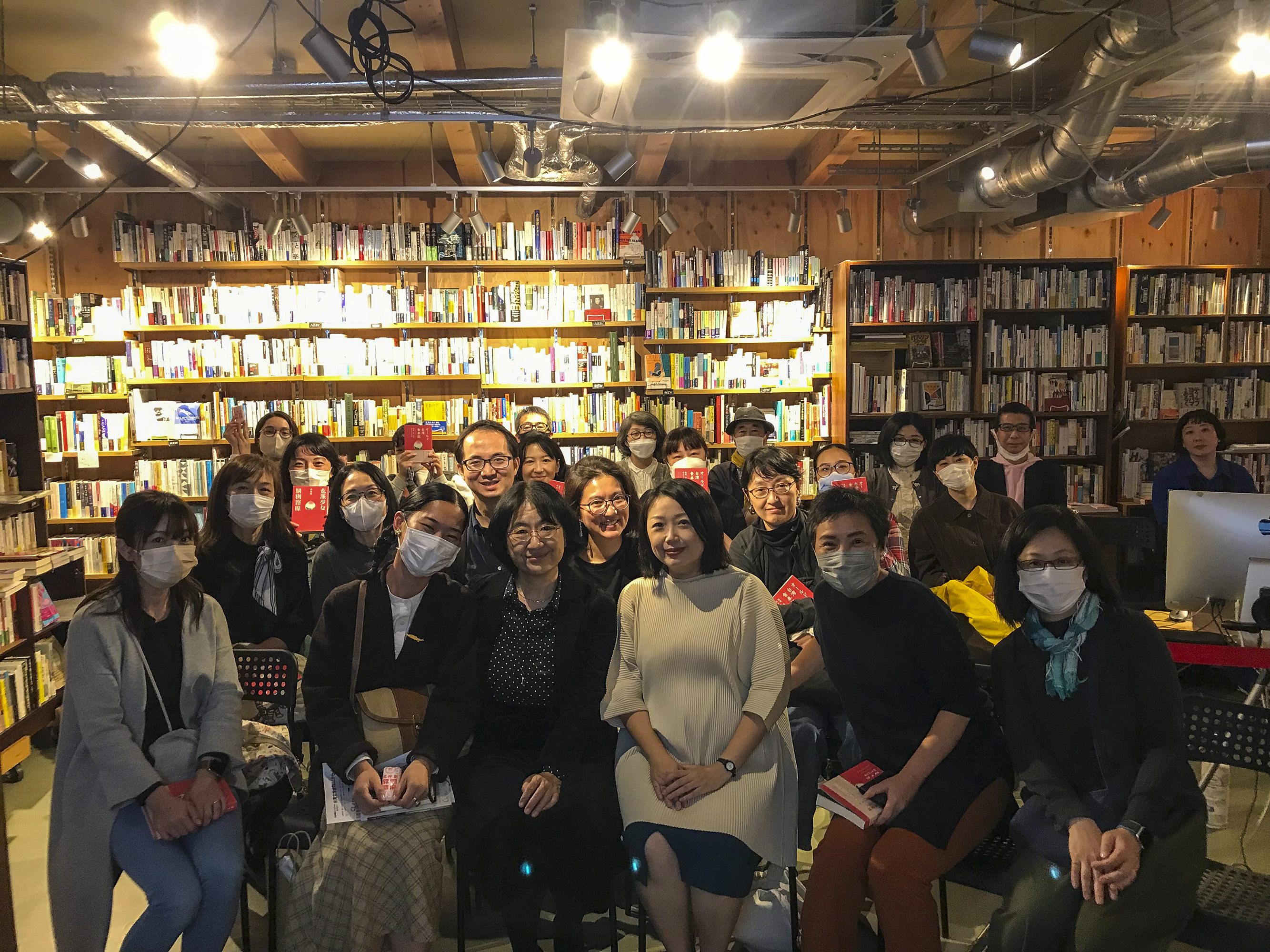 洪愛珠的《老派少女購物路線》,經太台本屋引介下出版日文版,經團隊安排,作者(前排右3)在東京書店舉辦講座,大受讀者歡迎。(太台本屋提供)