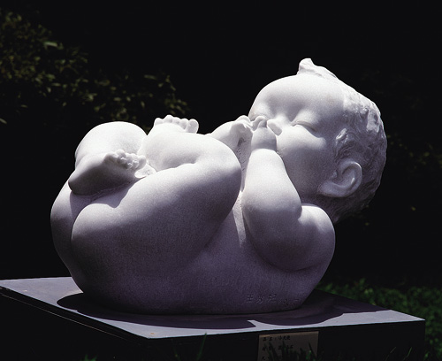 「笑容,是我在創作孩童形象上一個很重要的元素,希望藉著孩童清新自然的形象,引導社會大眾多看人性本善、純真的一面,」王秀杞強調。此系列採用顏色偏粉紅色的奧羅拉石和純白漢白玉石,粉嫩、純淨的素材語彙,無論是〈嘻笑〉、〈讀書樂〉或〈天之驕子〉,都讓人感受到愉悅、單純的幸福。