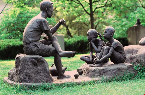 雕刻人像之初,王秀杞常以親人充當模特兒,此作即以父親和姪子姪女為模特兒雕作而成。