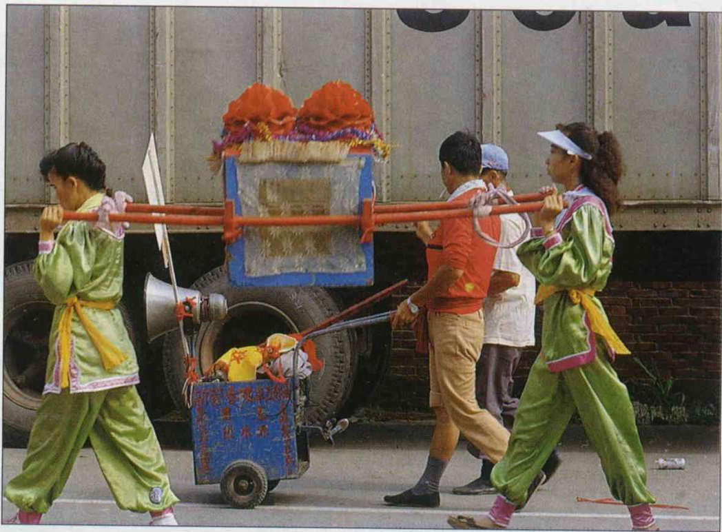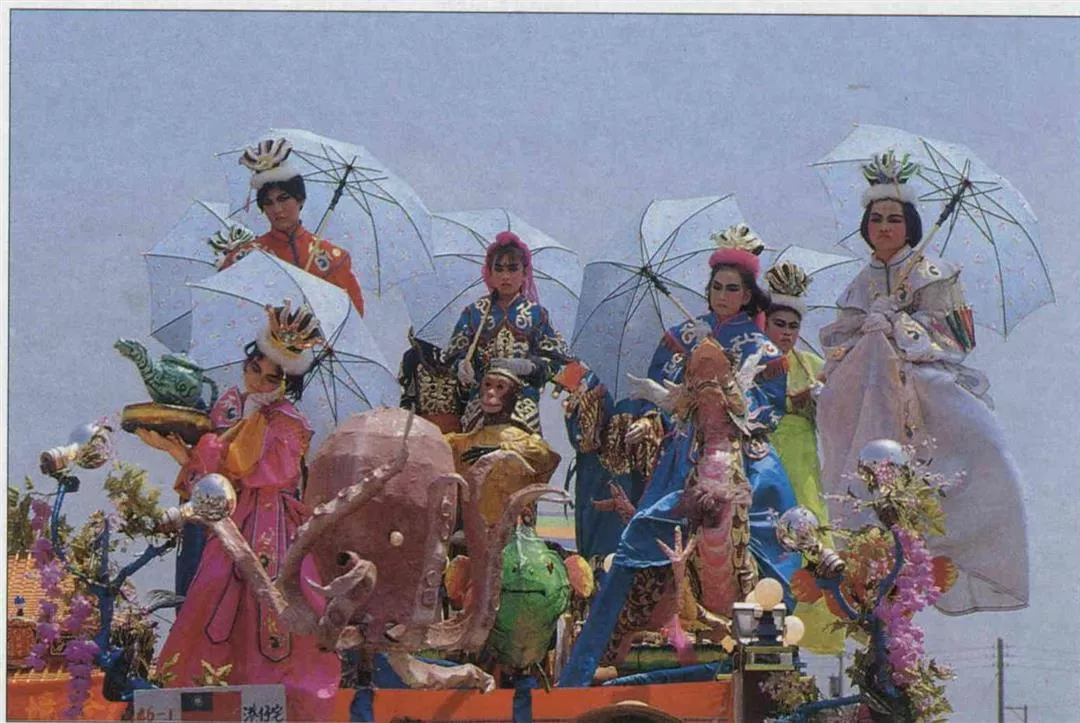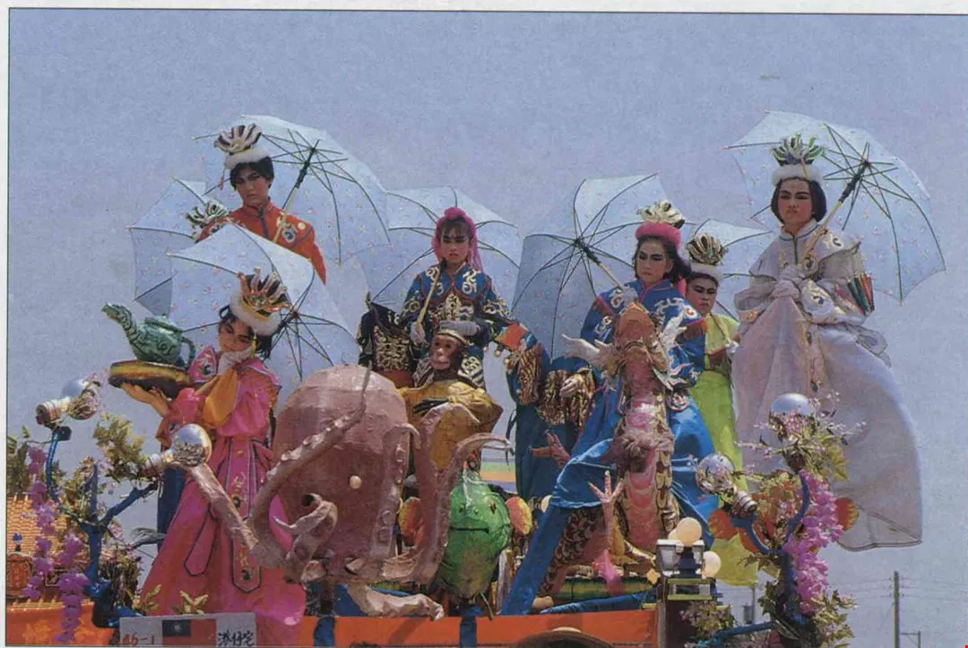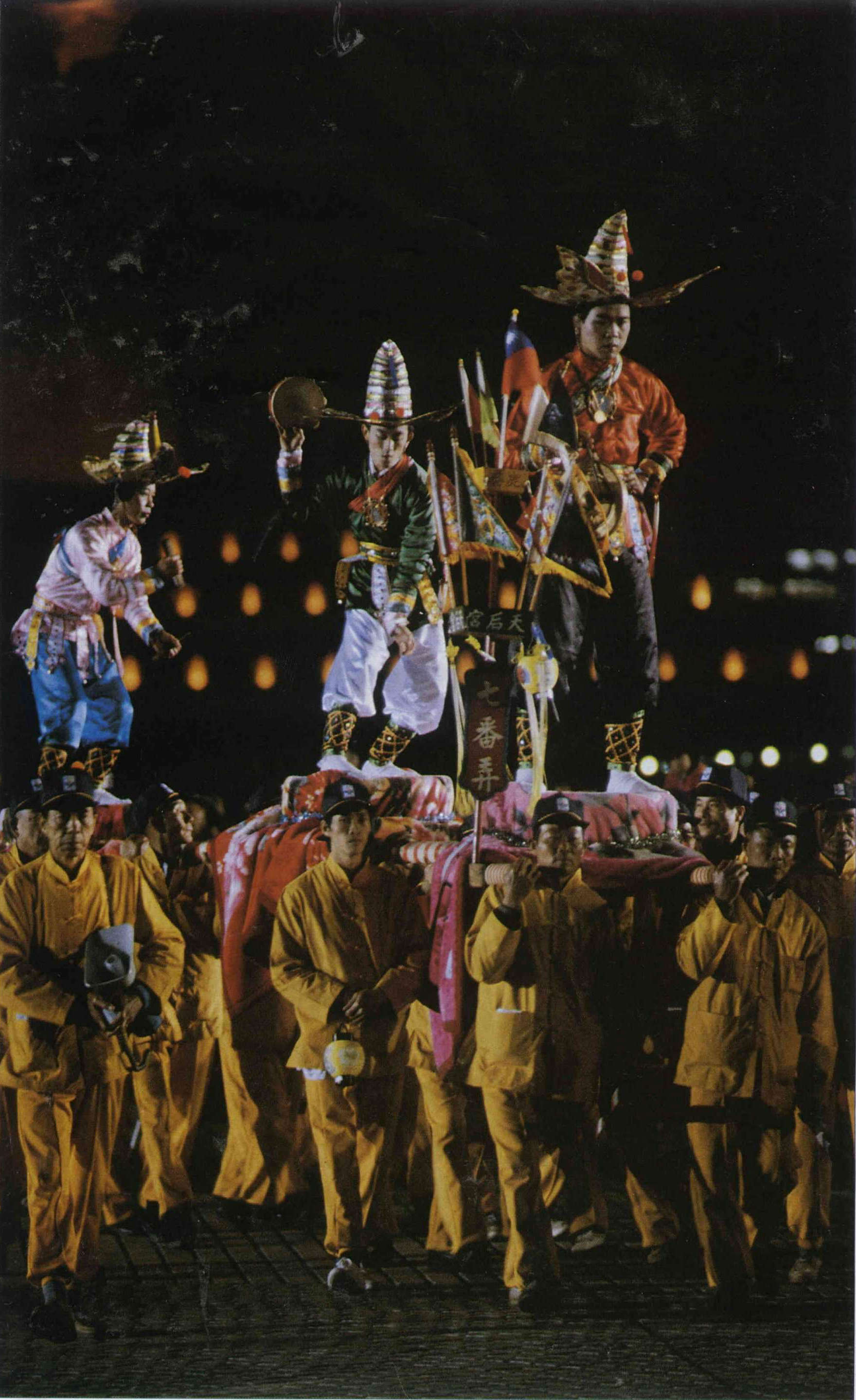 提起遊行,就會想到雙十國慶時總統府前的坦克、大砲和整齊劃一的隊伍,閃亮亮的展示國力;時下走上街頭的示威遊行,則以廣播車、口號聲,熱滾滾陳述其訴求;其實在民間,早有「遊行」傳統——每逢神明誕辰,信徒以妝扮富麗的「藝閣」和包羅萬象的「陣頭」表演,喜洋洋地敬謝神恩。