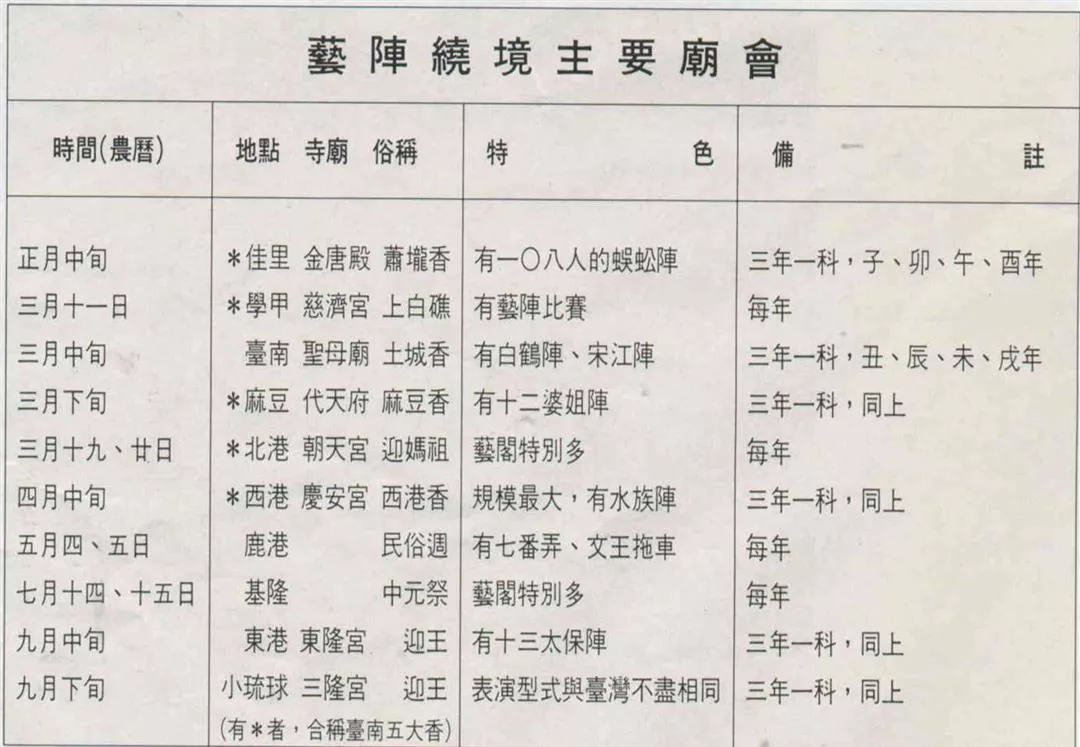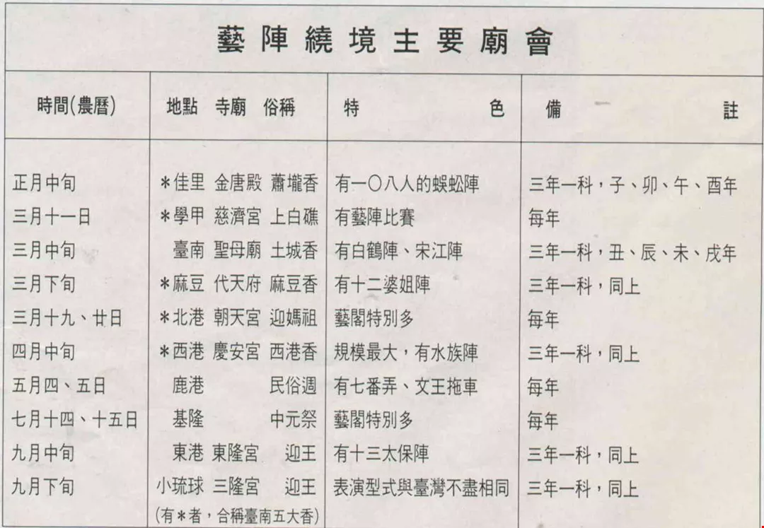 像台南縣西港鄉的慶安宮,其轄區便囊括鄰近的七十八個庄頭,每逢三年一科(次)慶安宮王爺祭,各庄頭便會派出神轎、陣頭前去捧場。此外,農曆「二月佛祖生,三月上帝爺生、媽祖生,四月王爺生,五月關帝爺生,九月太子爺生」,皆有隨進香隊伍前去表演的陣頭,但進香期各團去的時間不易掌握。觀賞陣頭,仍以各團聚集一起遶境的廟會為佳。