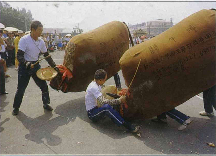 要看鬥牛何需遠渡西班牙,民間廟會中的「鬥牛陣」,熱鬧又有趣。(黃麗梨攝)