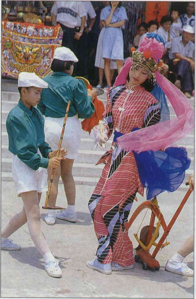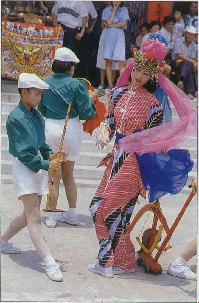 而桃花過渡就更慘了,不僅不歌,連舞也省了,原本是小丑拿槳,小旦持絹,對答唱作。而在台南學甲鎮上白礁所見的桃花過渡,只見船搭在貨車上,小旦、小丑靜坐其上,一個猛吹鬍子,一個頻拋媚眼,不僅不像小戲,也不再是邊走邊演的陣頭,勉強倒可歸入藝閣之中,連型式也變了。