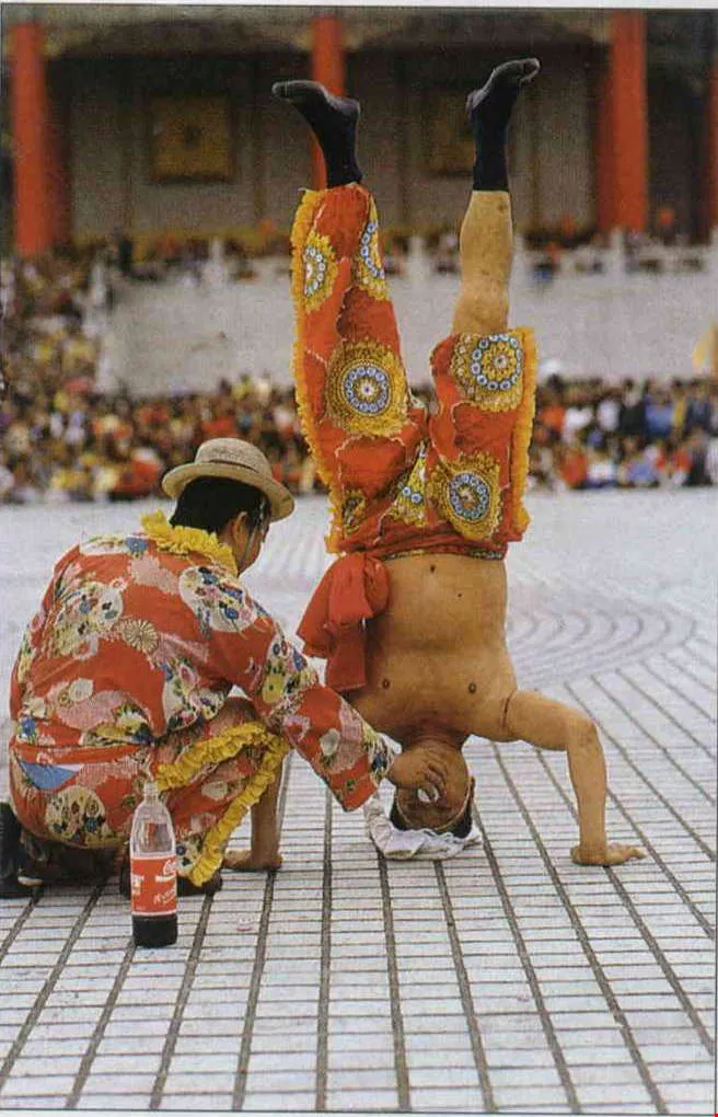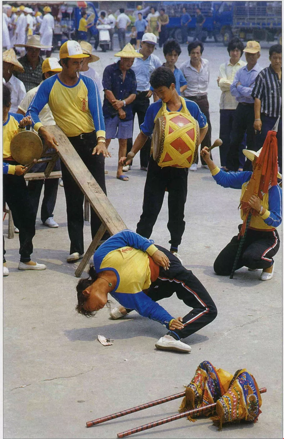 在同業競爭及投觀眾所好下,「跳鼓陣」不跳不打鼓,紛紛演出彎腰咬錢的軟骨功把式。(鄭元慶)