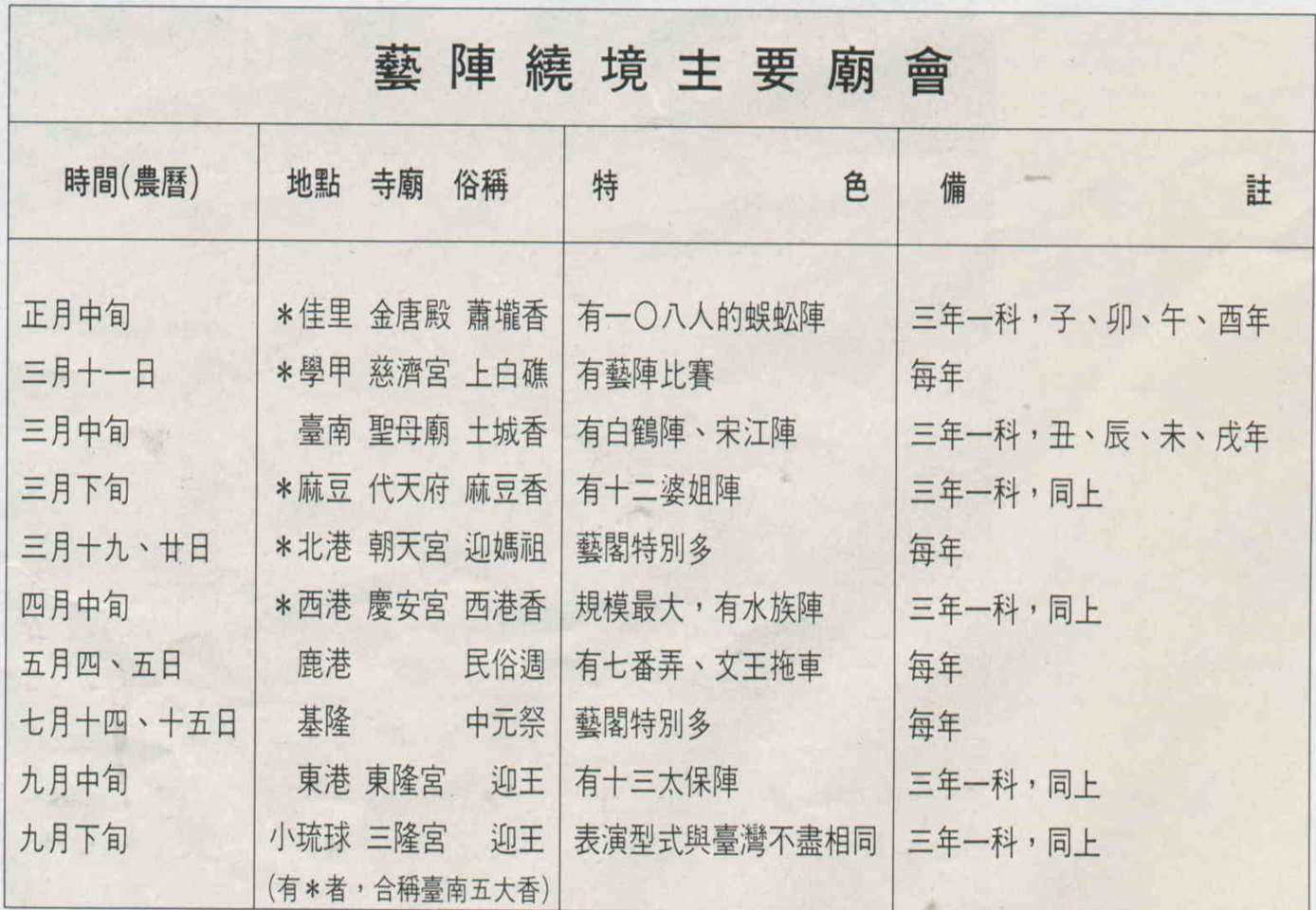 此外,南部的神明廟會頻繁,在經濟環境改善之餘,更是擴大熱鬧場面。各式藝陣不但有用武之地,互相刺激較量,更進而創出新的藝陣。這些原因湊合下,嘉南平原成了藝陣的「快樂天堂」。