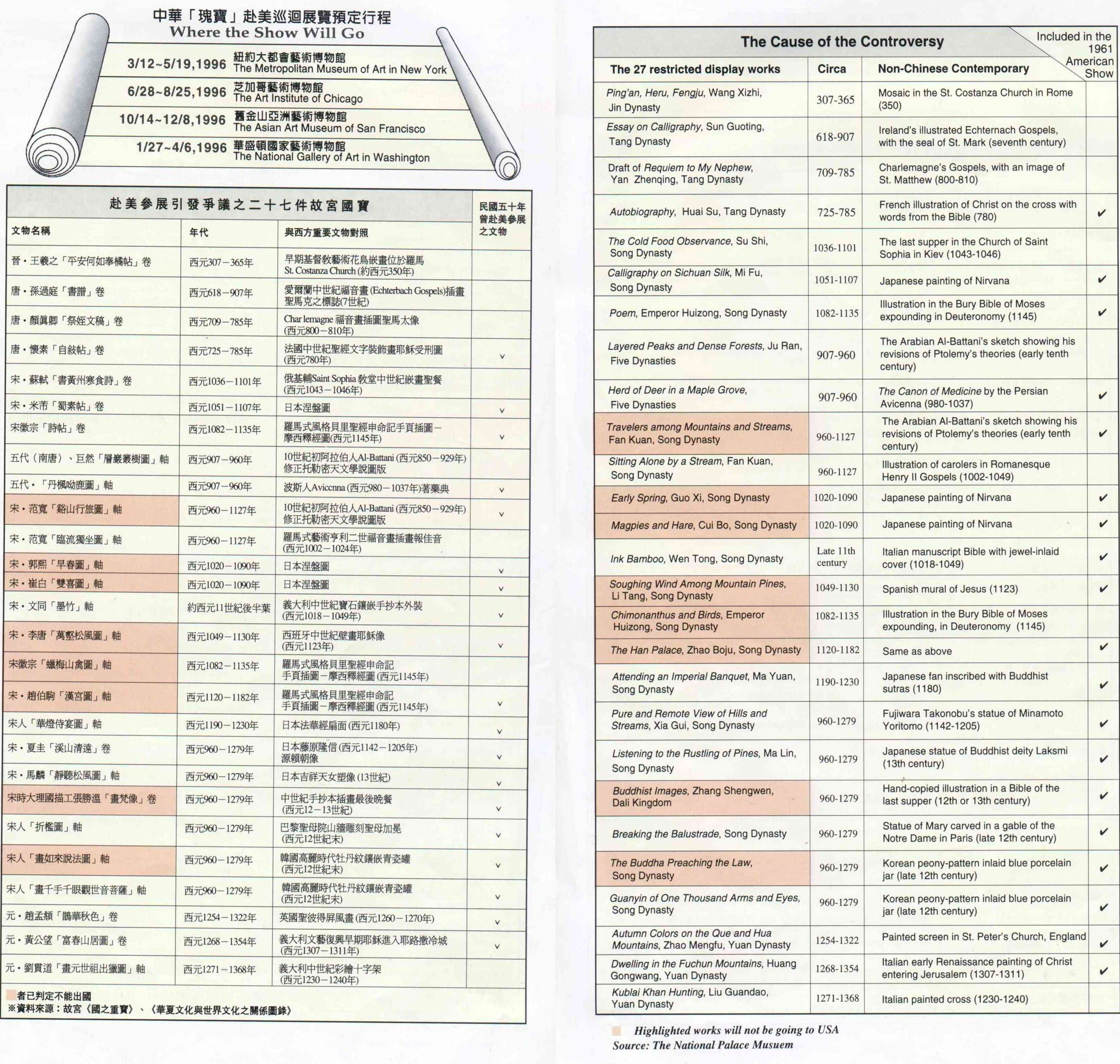 另外,學界的人士包括傅申、石守謙,及前歷史博物館館長何浩天,都以書面表示贊成限展書畫出國。而何浩天的書面理由是:「我辦展出三十一年了,能爭取到美國四大博物館展出是難得機會。文物出國就好比出去打仗,必然有風險。歷史的榮耀不就是靠此得來的嗎?」