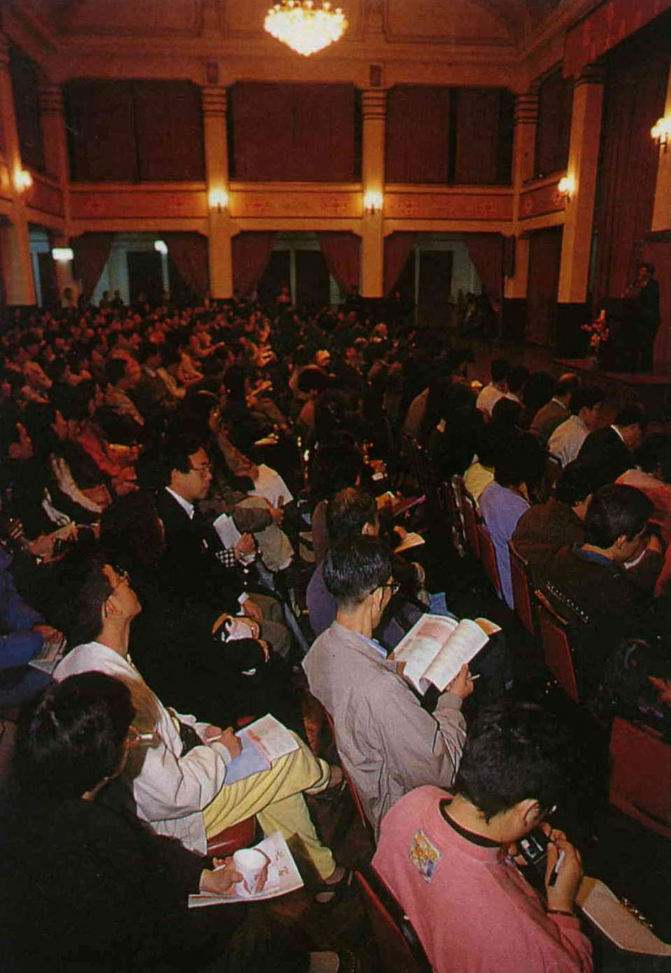 股票族齊聚中山堂,仔細聆聽道家學術研究會理事長李亨利的演講,為的是瞭解虎年的財運走勢。(邱瑞金)