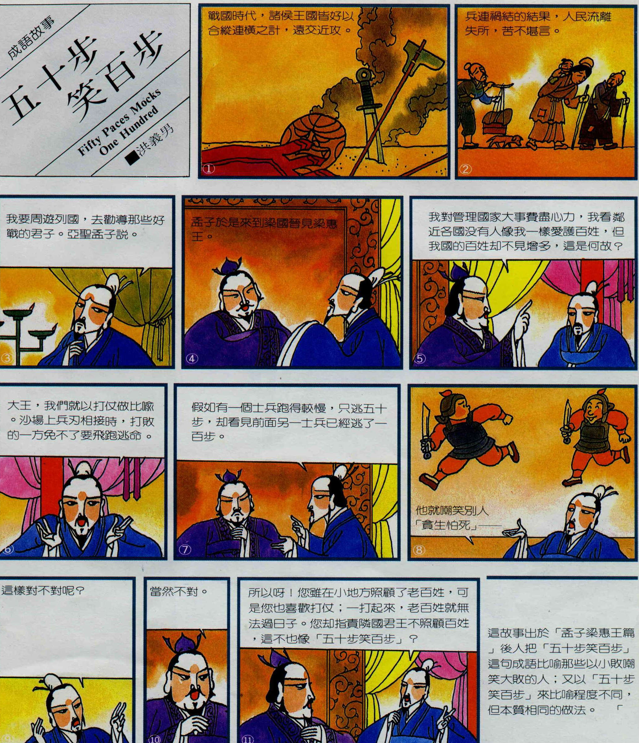 這故事出於「孟子梁惠王篇」後人把「五十步笑百步」這句成語比喻那些以小敗嘲笑大敗的人;又以「五十步笑百步」來比喻程度不同,但本質相同的做法。