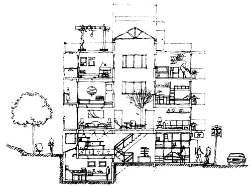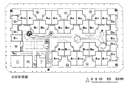 捨棄兩排式長條販厝傳統,藉共有庭園促進鄰里間互動;完成於1984年的「唐莊」,其大膽嘗試對台灣社區建築影響深遠。