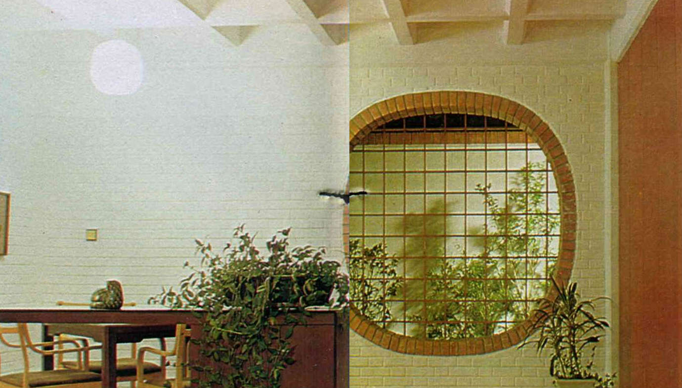 建築師王大閎為自己設計的住宅,在客廳開了一扇橢圓形的窗,並在窗櫺後,放了幾株綠色盆栽,頗具林園情趣。