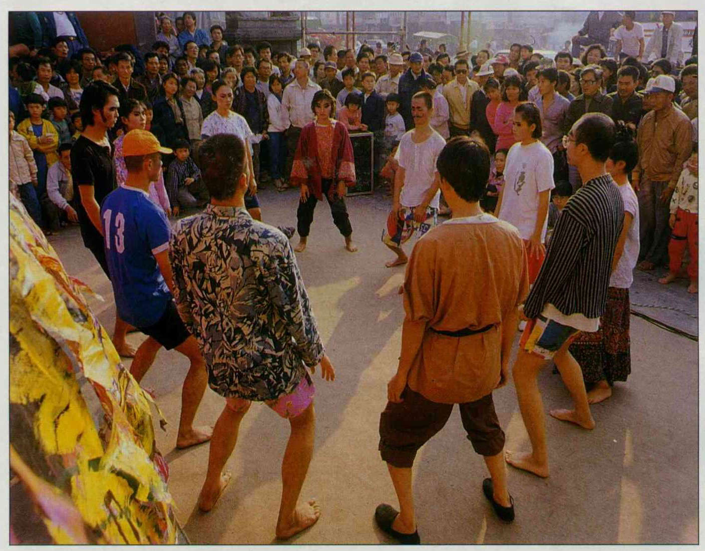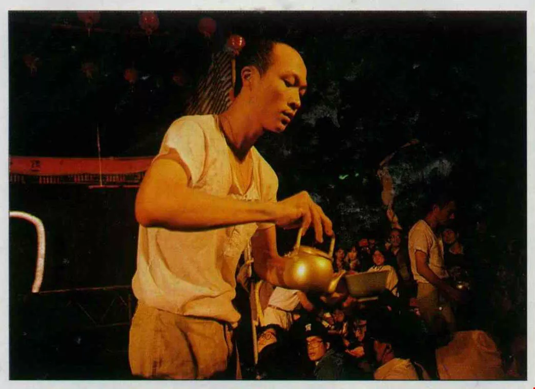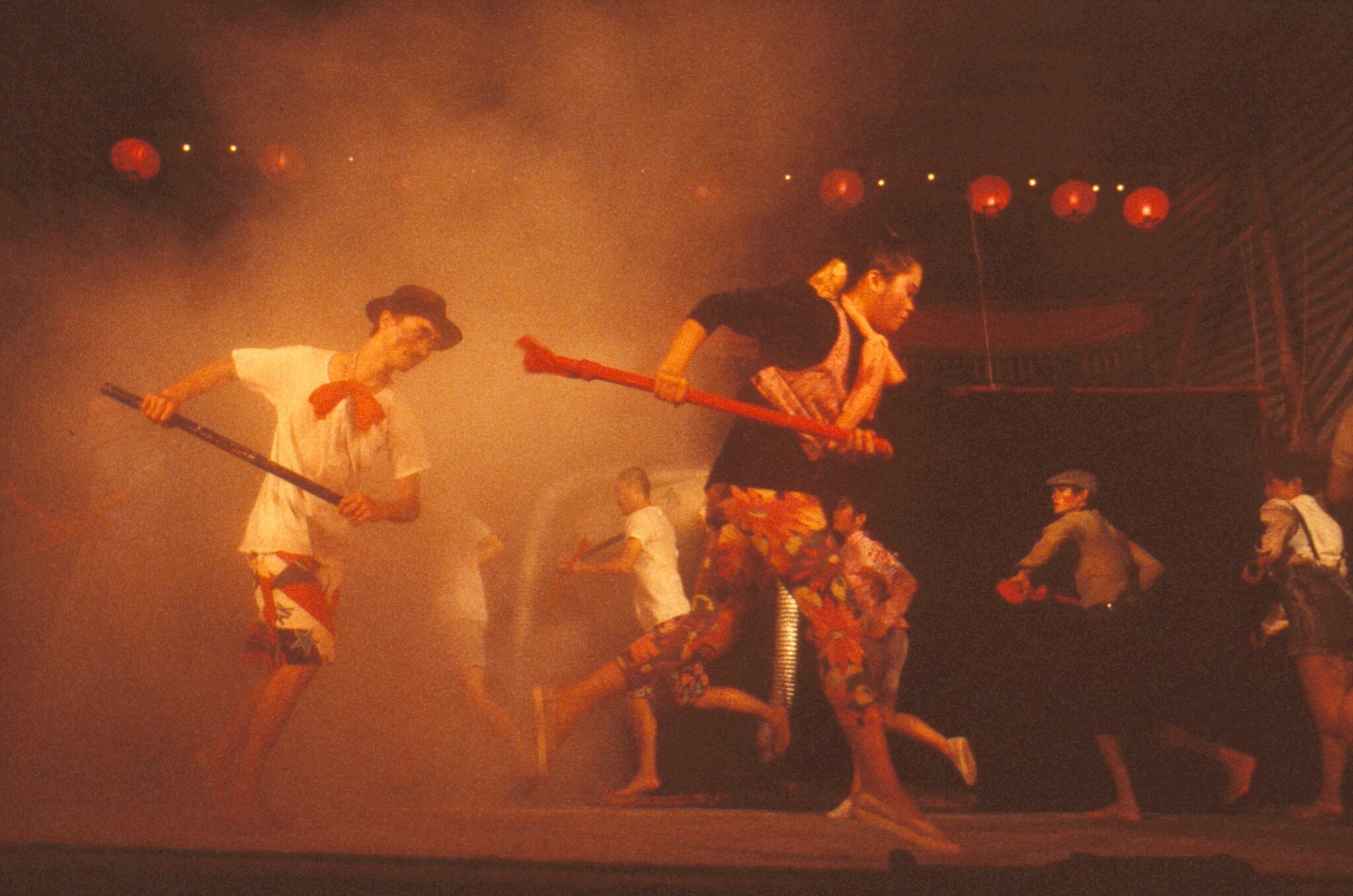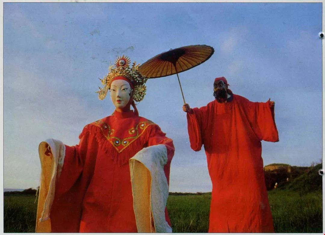 這一連串回歸意味濃厚的準備,在實驗劇場果然令人一驚。八人大轎與演員扮成的高大戲偶,穿梭在淒冷的哭墓歌中,使人嗅出近於宗教儀式的幽冥氣息;至於寬大的戲袍和面具則考驗著受過氣功和太極訓練的演員在發聲及動作上的實力。