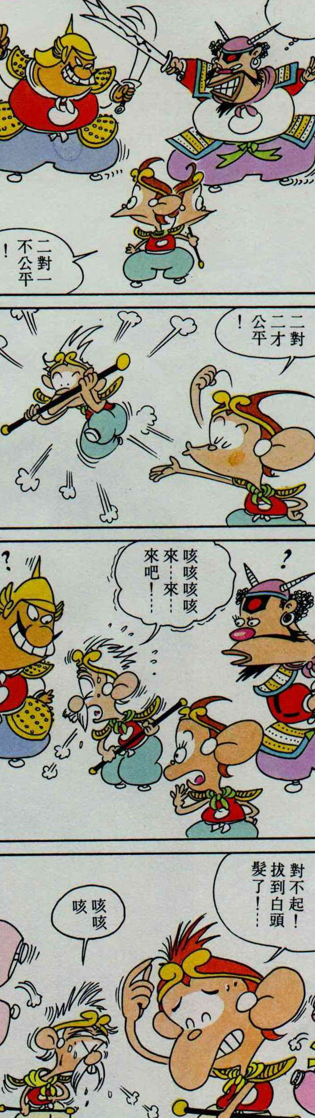 前陣子報紙頭版全三批廣告裡也出現了手持金箍棒的齊天大聖。他跳在中式漢堡上,笑嘻嘻地作揖道:「麥當勞,對不起啦!」大有恃藝挑釁的意思。