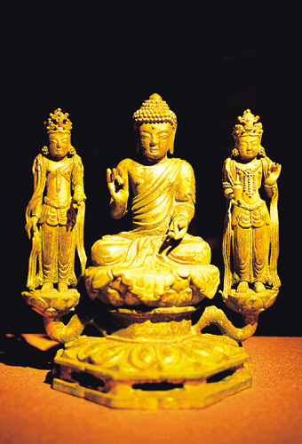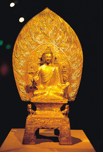 在南亞和東亞文化圈之間,故宮特別設立了一個佛像夾道的轉折處,通道的盡頭旁則是本次展覽最受矚目的兩件藏品:北魏金銅佛坐像與絹本五代觀音曼荼羅圖,這兩件市價超過十億新台幣的珍品,因為被日本列為重要文化財,不准流落日本國外,於是彭楷棟將之捐贈給台灣駐日代表,再轉借故宮做短期展覽。
