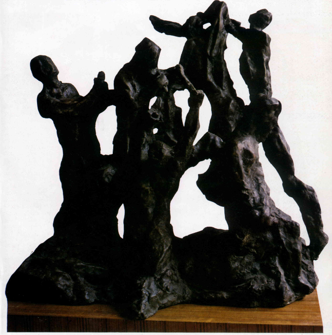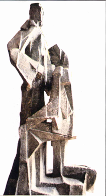 他最感滿意的作品之一,就是在藝專畢業那年,為台南延平郡王祠鄭成功紀念館所塑造的一件作品,名為「屈服」,這個作品採取立體派塊面分割手法,表現受降的主題——一位荷蘭人跪在鄭成功面前,下面則有海浪的線條代表台灣海峽,三者造型緊密地連結在一起。