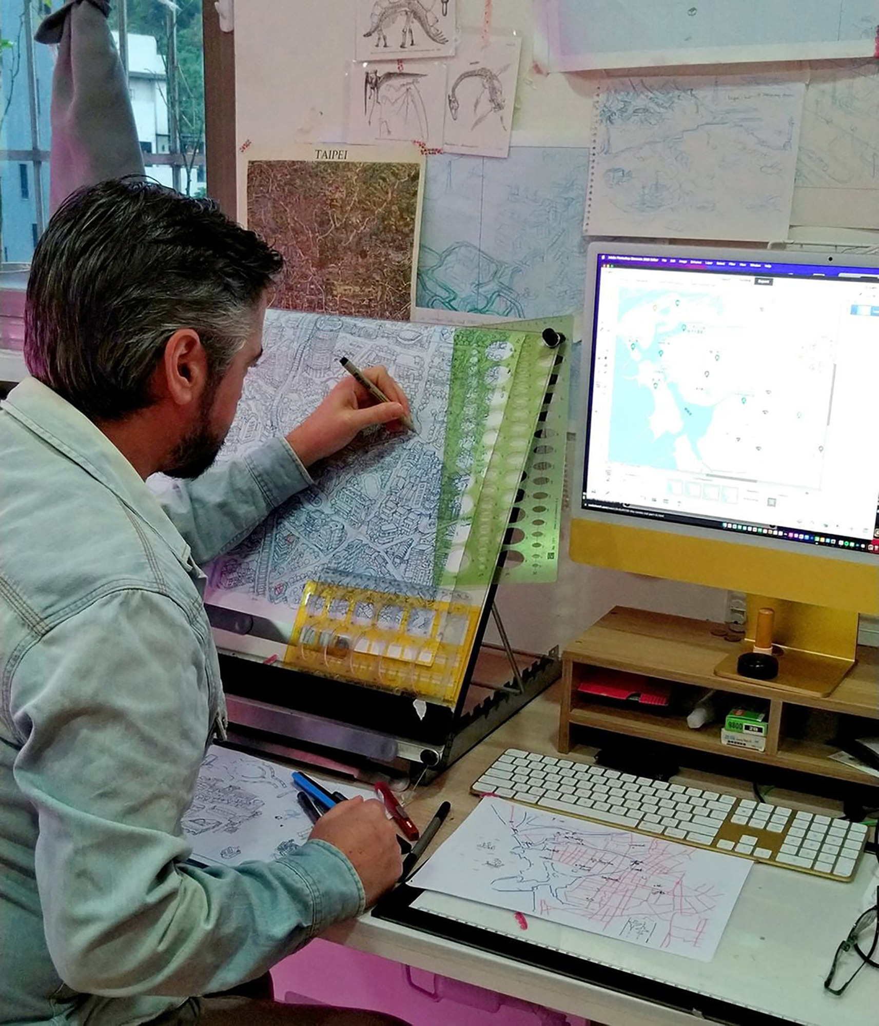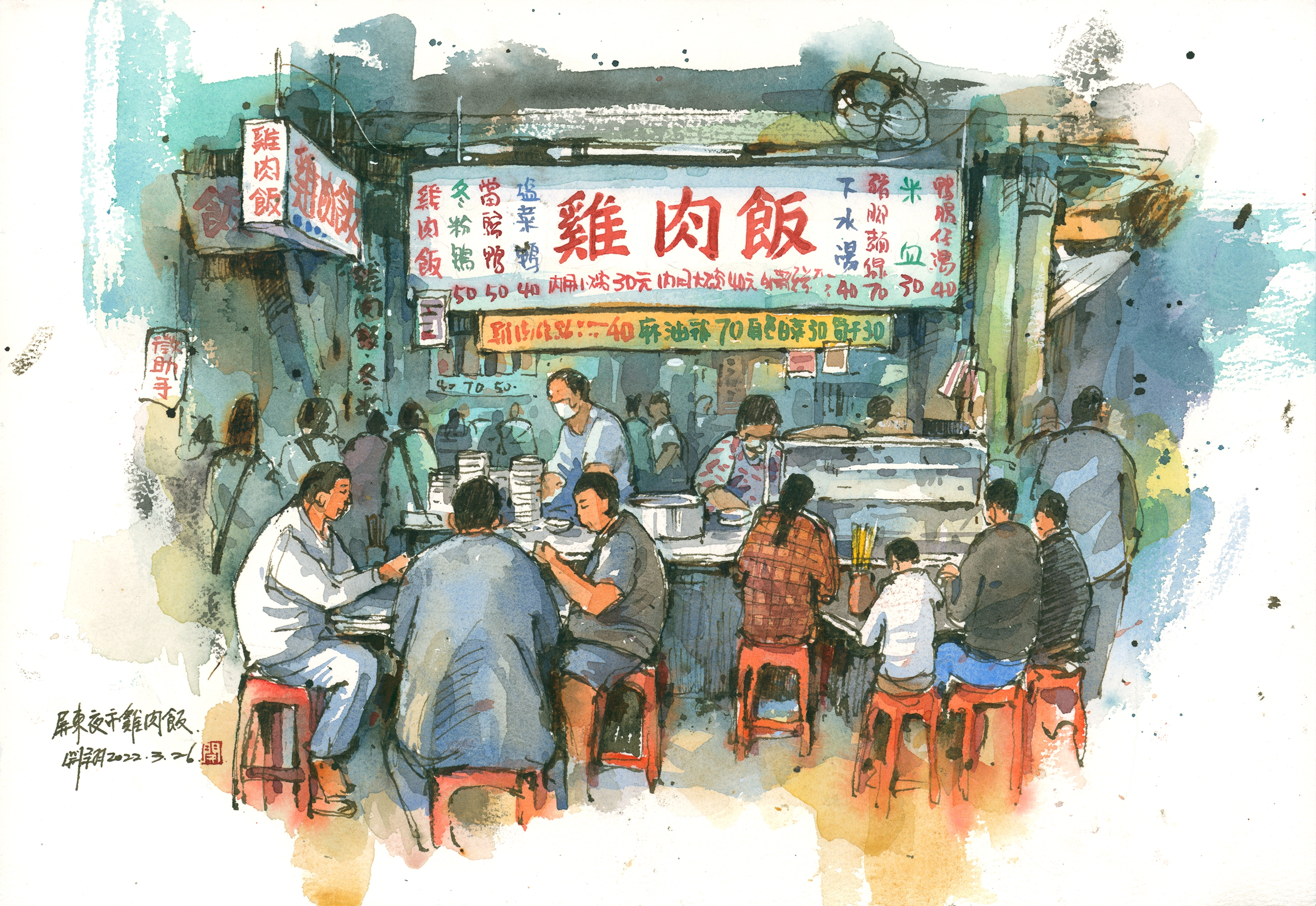 還有許多在地的特色,讓他進一步探尋後放入畫中。例如澎湖許多招牌不是從側面長出來,而是貼著建築立面,想必是因應澎湖十月到隔年三月強烈的東北季風;他也觀察到有雨都之稱的基隆,許多摩托車都會有個大風鏡。