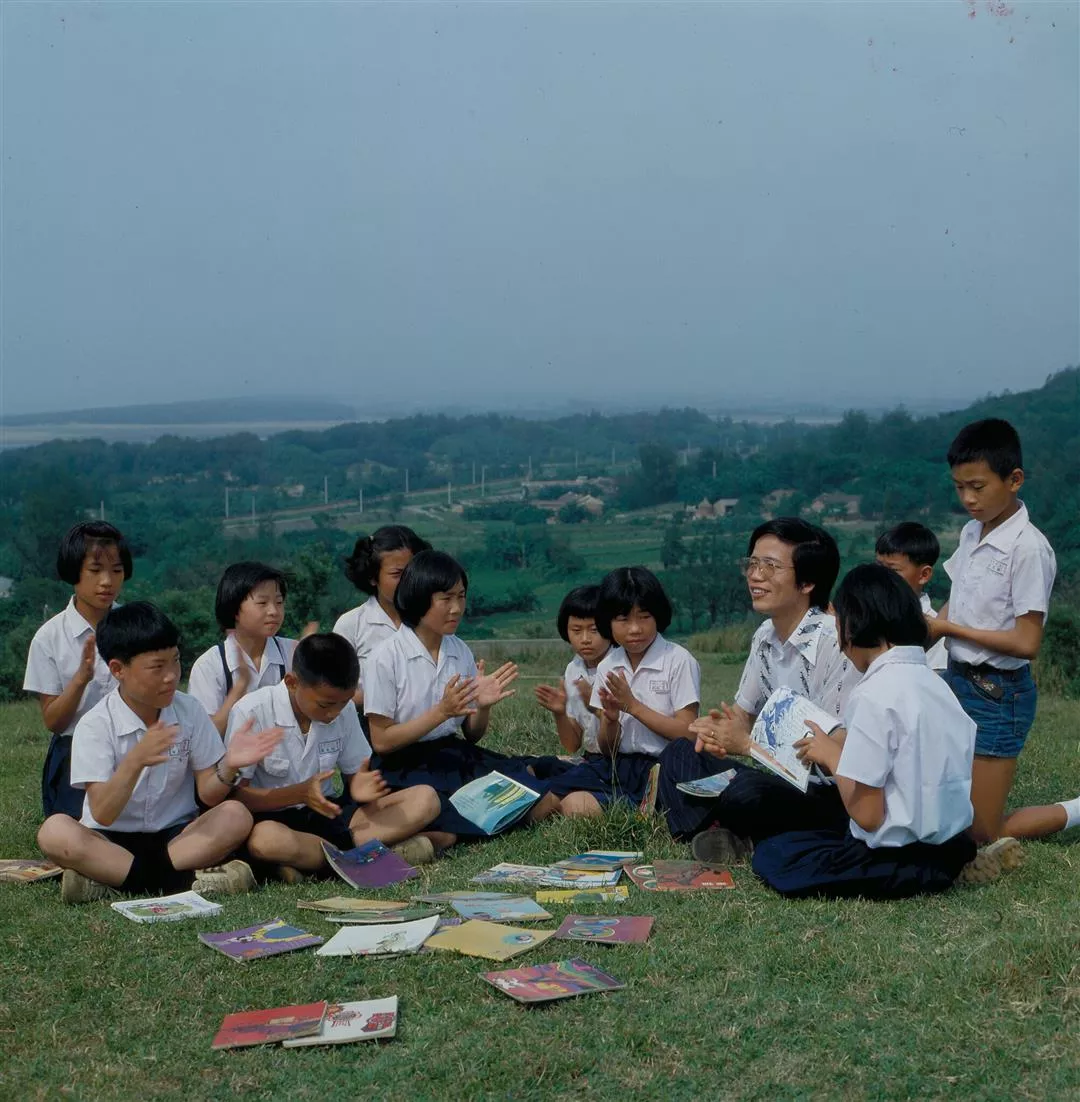 杜榮琛老師帶海寶學童到戶外上課,有一位小朋友朗誦了一首她的童詩作品,老師和其他小朋友都熱烈鼓掌給予鼓勵。