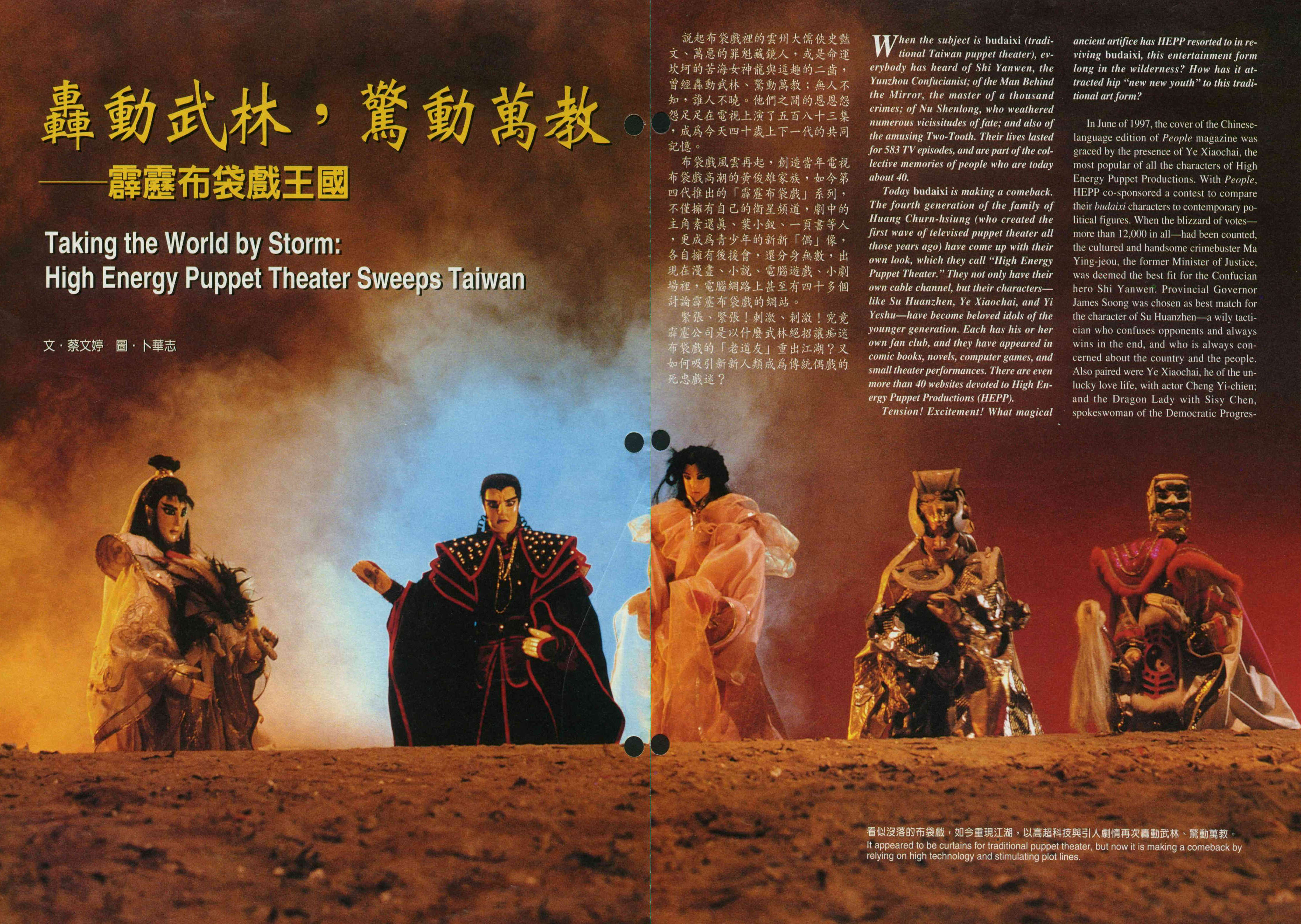 去年六月,由霹靂衛星電視公司製作的「霹靂布袋戲」裡,人氣最旺的葉小釵登上了「People」國際雜誌中文版的封面。在這個雜誌社與霹靂衛星電視公司合辦的票選活動中,一萬兩千多張選票如雪花般湧進,表達戲迷們心目中理想偶像的代言人──雲州大儒俠由溫文儒雅、斯文俊秀的掃黑英雄馬英九高票當選;而習慣以力借力贏得最後勝利,似真似假、滿腔憂國憂民的素還真,其化身是省長宋楚瑜。此外多情坎坷的葉小釵是曾經演過多部「古惑仔」電影的俊美小生鄭伊健;女暴君由民進黨文宣部主任陳文茜獲選。當紅布袋戲偶像與高度敏感的政治人物對號入座的古今配對,引起廣泛的討論與報導。