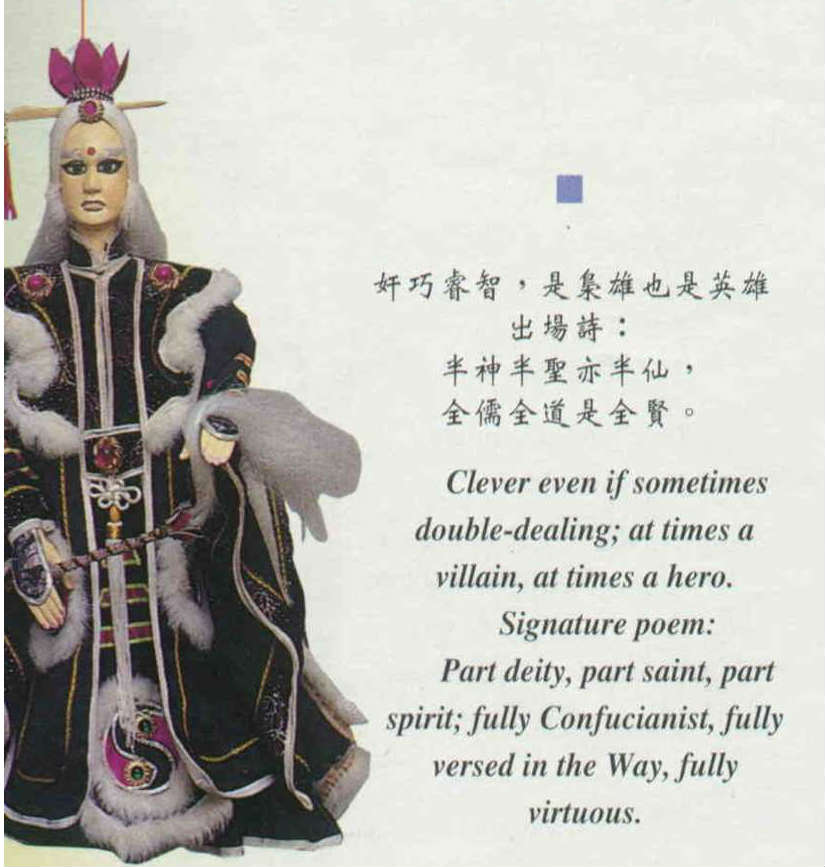 奸巧睿智,是梟雄也是英雄出場詩:神半聖亦半仙,全儒全道是全賢。(卜華志)