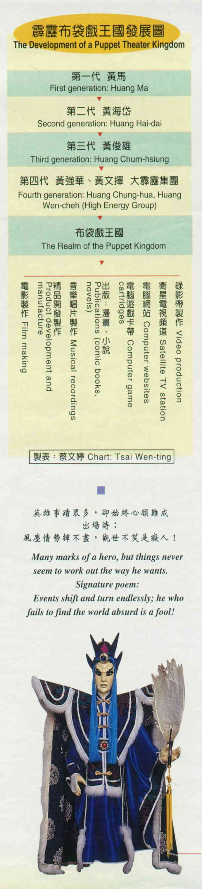打從阿公黃海岱就一改布袋戲以歷史公案劇為主的演出,根據民間的章回小說,發展出膾炙人口的劍俠戲。爸爸黃俊雄則是金光戲的開山宗師,至於黃強華兄弟則將布袋戲的經營變成一種全新的企業。