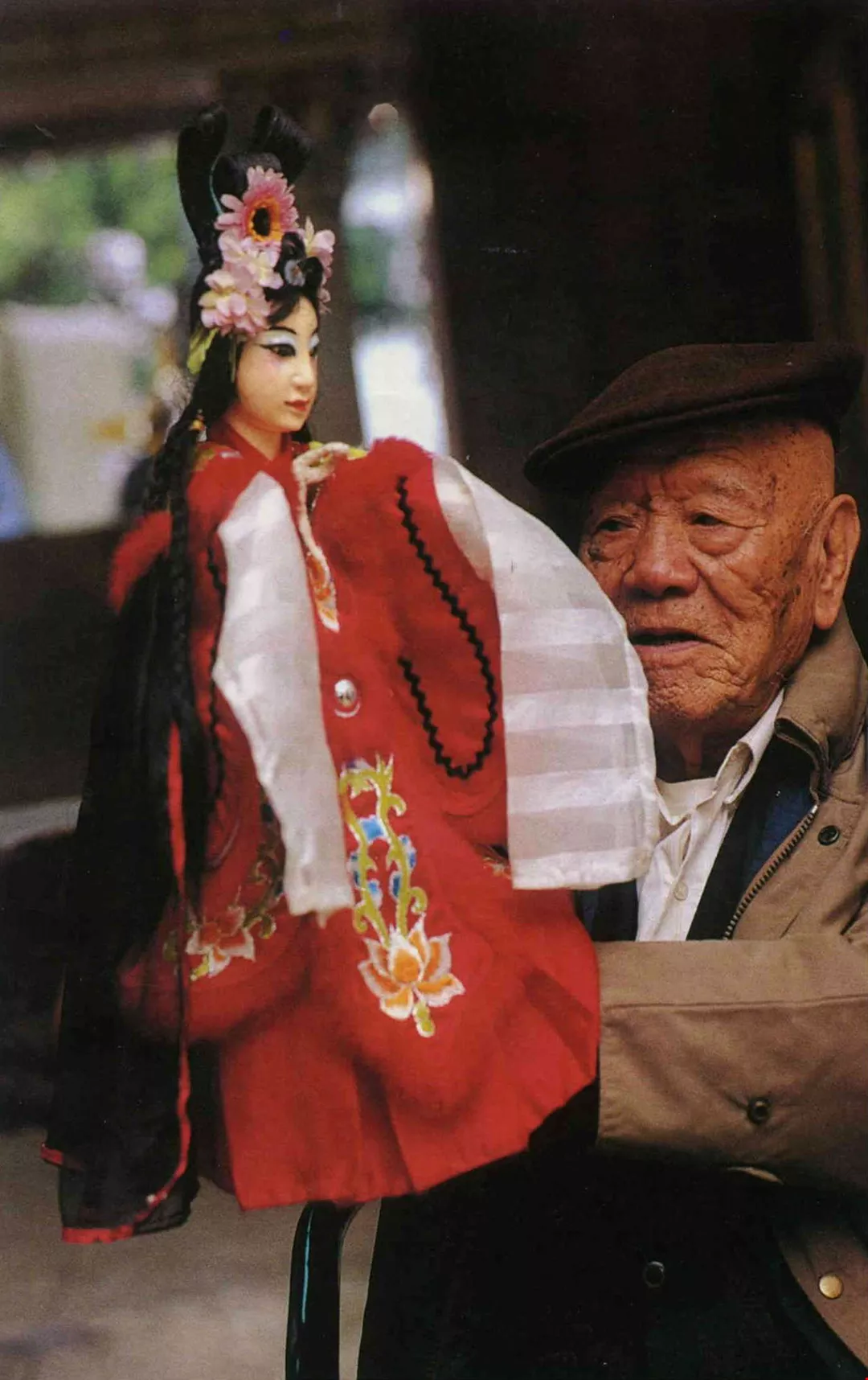 一個下午,九十七歲的黃海岱自己坐公車來到孫子的攝影棚,身體硬朗的他,拿起兩個戲偶就唱作起來,阿公說;「男步粗、女步細」,大家閨秀的小旦就在婀娜細緻的身段中、緩步優雅地欠身坐下。隨意一出口,從周文王到三國時代每一個故事都說得有情有義,引人入勝。