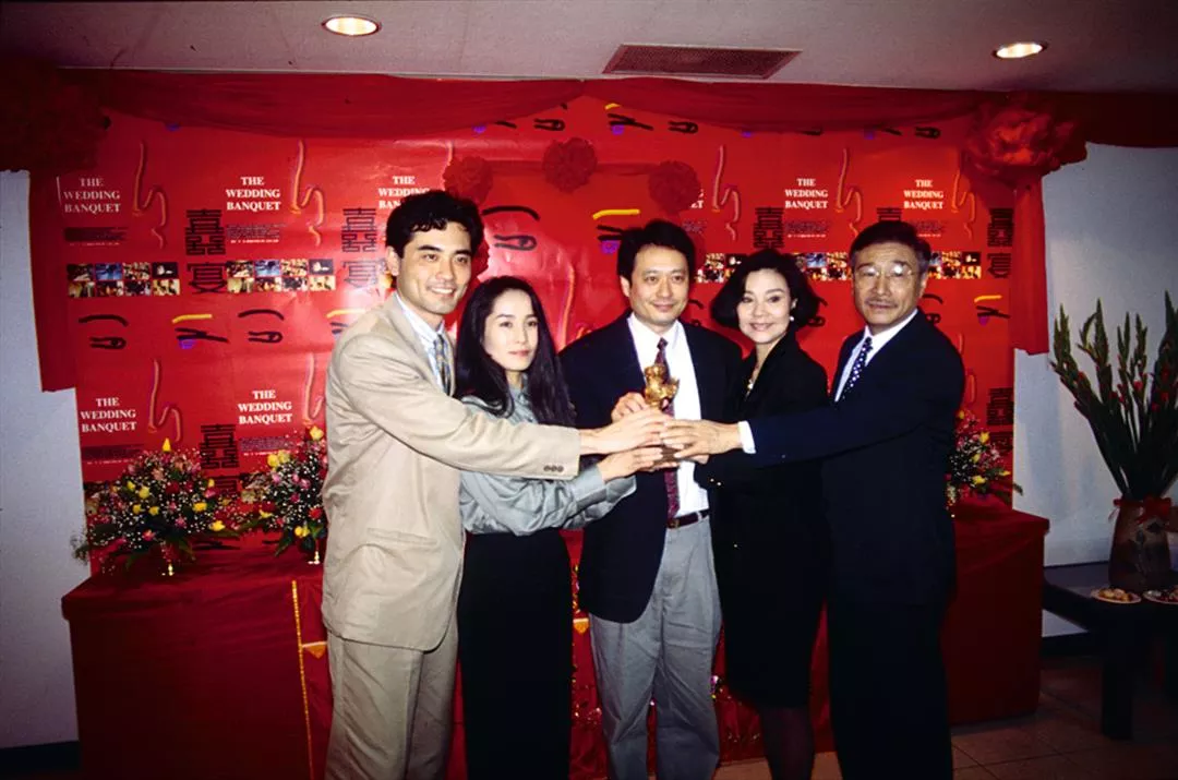 1993年《喜宴》獲得柏林影展金熊獎,返國歡迎酒會上,李安開心與演員們合影。
