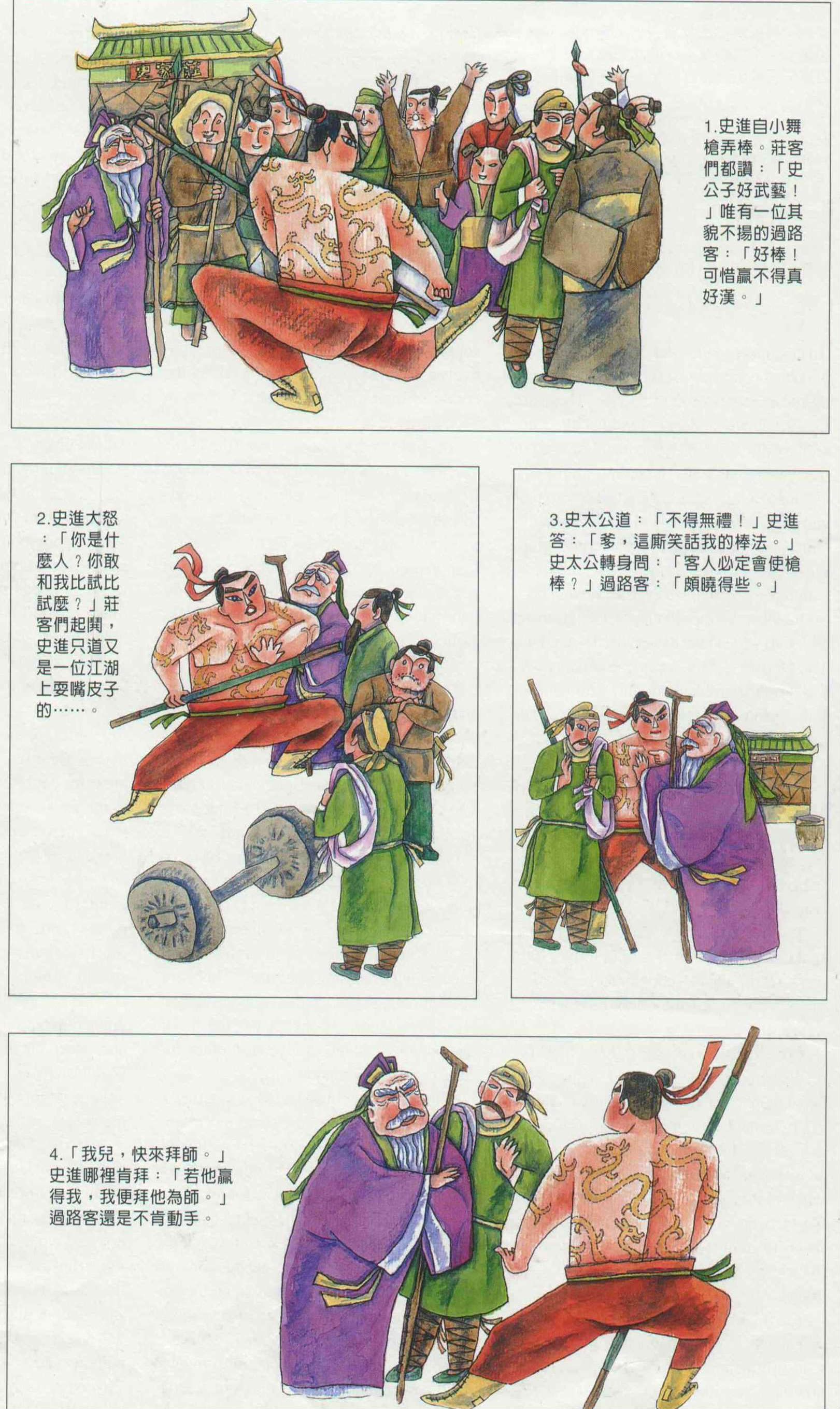 4. 「我兒,快來拜師。」史進哪裡肯拜:「若他贏得我,我便拜他為師。」過路客還是不肯動手。