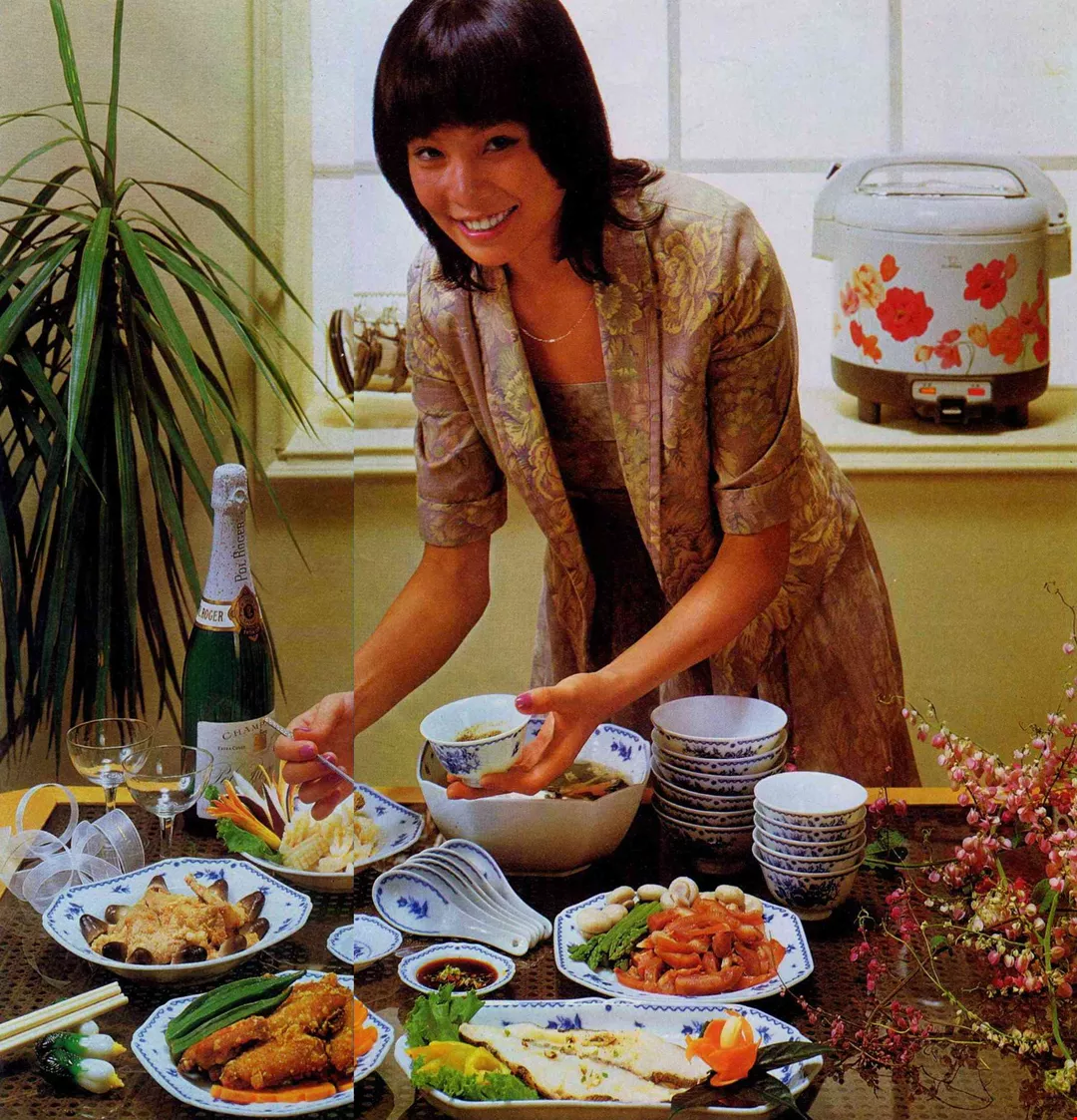 快樂的家庭主婦將可口的菜餚盛放在高雅的瓷餐具裏,把餐桌裝點得賞心悅目。