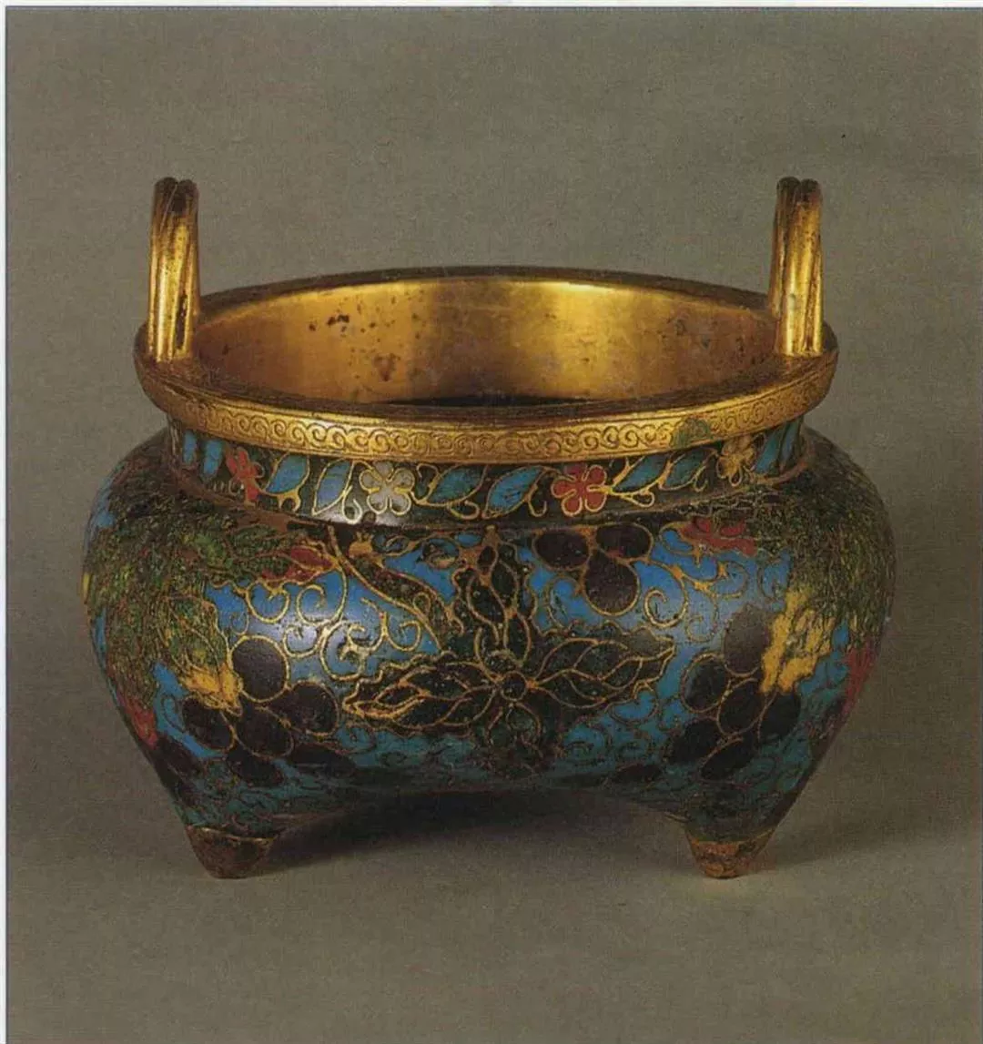 明景帝景泰年間的掐絲琺瑯器登峰造極,因而至今琺瑯器仍通稱「景泰藍」。圖為明中期的「掐絲琺瑯葡萄紋香爐」。(故宮博物院提供)