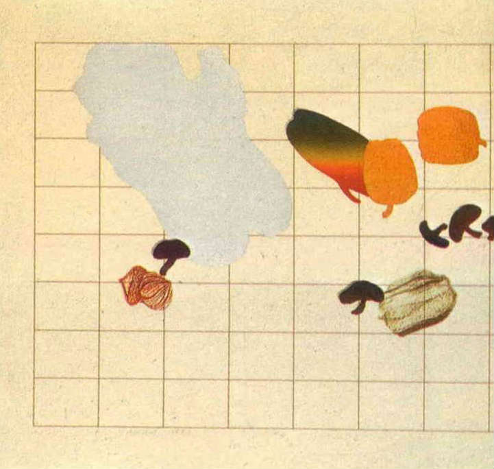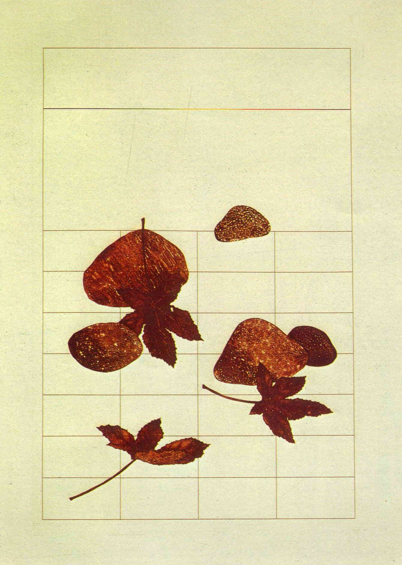 「四季美味」裏的方格,象徵機械式的規格化社會,至於方格內的留白,是廖修平從中國水墨畫體味出來的,能使人得到休閒與寧靜。