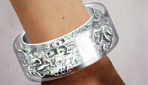 設計「冰銀」手環時,柯迪介以簡潔的透明結構把銀飾懸空內外夾住,讓精細脆弱的銀飾受到保護,而在視覺上也產生多層次圖形變化。內側則刻意開口,強調手環的剖面,內嵌的銀飾花樣有如寺廟柱雕的鏤空手法,以突顯作品擷取傳統宗教文物之美,而展現出現代時尚新意的況味。