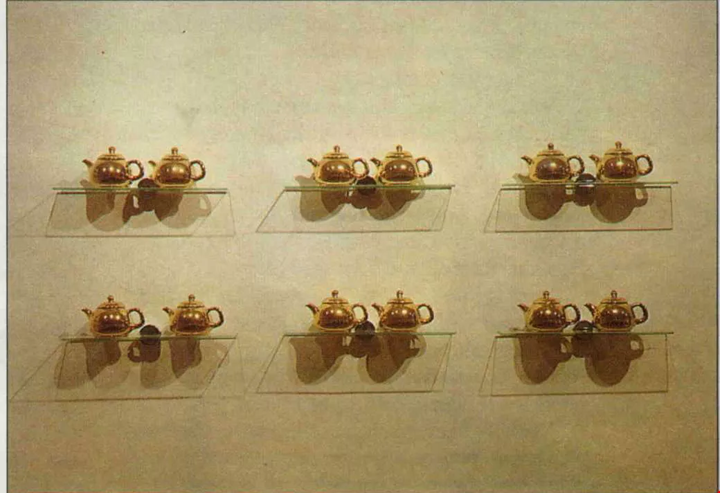 現成買回的宜興壺,經過范姜明道燒金之後,被一個個供在架上。屬於中國人的宜興壺是被神話了,或被商品化了呢?圖為作者九四年的裝置作品「金宜興」。(范姜明道提供)