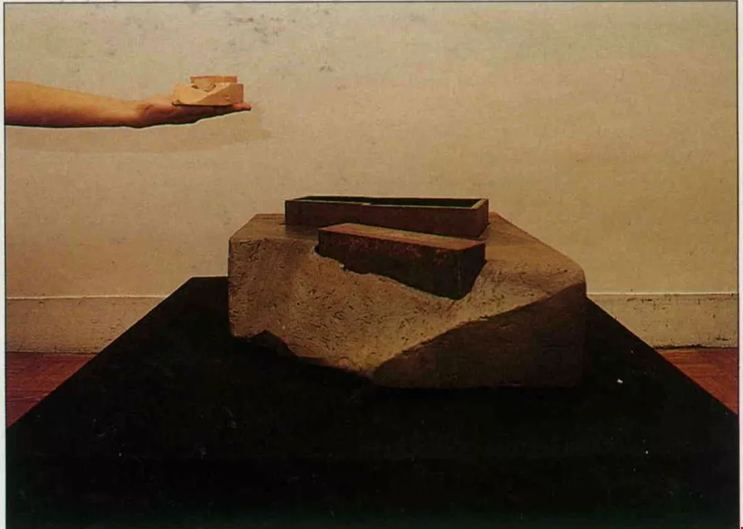 陶/鐵系列 一九九四 52×59×24cm 鐵原焠煉自土,將鐵再與土結合。不論陶鐵或陶木系列,陳正勳都在傳達「回位」的創作理念。左邊手上為其作品的小型試樣。(薛繼光)
