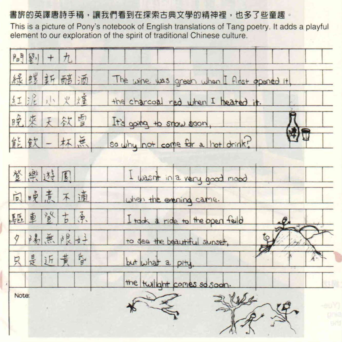 如今每個晚餐過後的夜晚,我最愉快的一件工作就是和小女兒一起讀一首唐詩,這雖是重複四年前和大女兒一起做的工作,但我絲毫沒有倦膩的感覺,用的方法也不盡相同。對我來說,與其讓書旂認識更多的中文字來當成工具,不如讓她在學習中也同時能觸摸到母國文化的氣息。我選擇唐詩的理由是因為書旂已在課堂上學會用英文做日本俳句,她把這種十七個音節的短詩所蘊涵的意境掌握得非常好,我知道這是帶她讀唐詩的好時機;果然,她非常喜歡,一天讀一首,問了我許多問題,並且把她讀過的每一首詩都翻譯成英文,整整齊齊用最美的字體抄在稿紙上並畫上插圖。當我翻看這些日積月累的作品時,心中感到很寬慰,也決心要更下工夫來帶領兩個受外國教育的孩子在文化的探索裡找到真正的自己。
