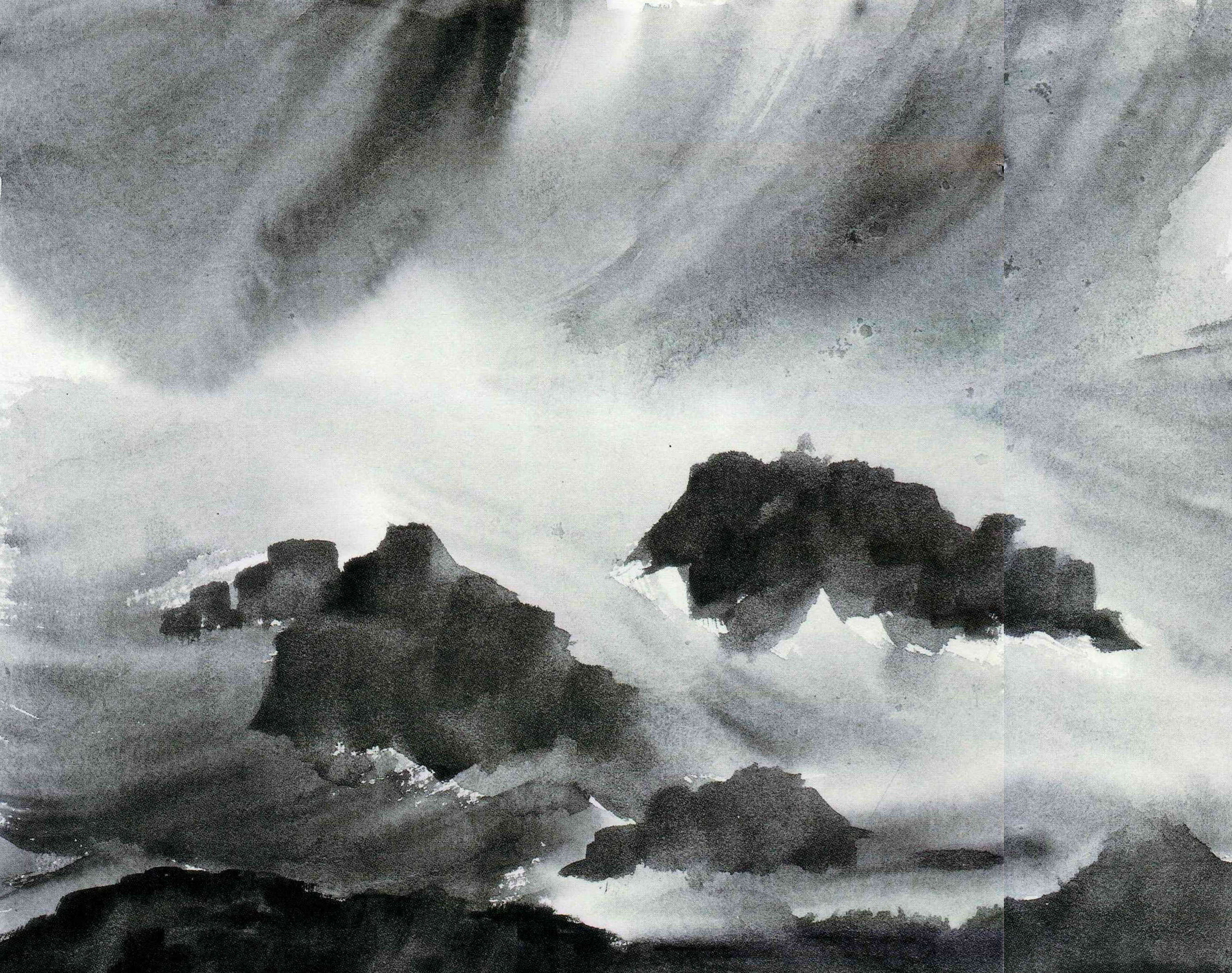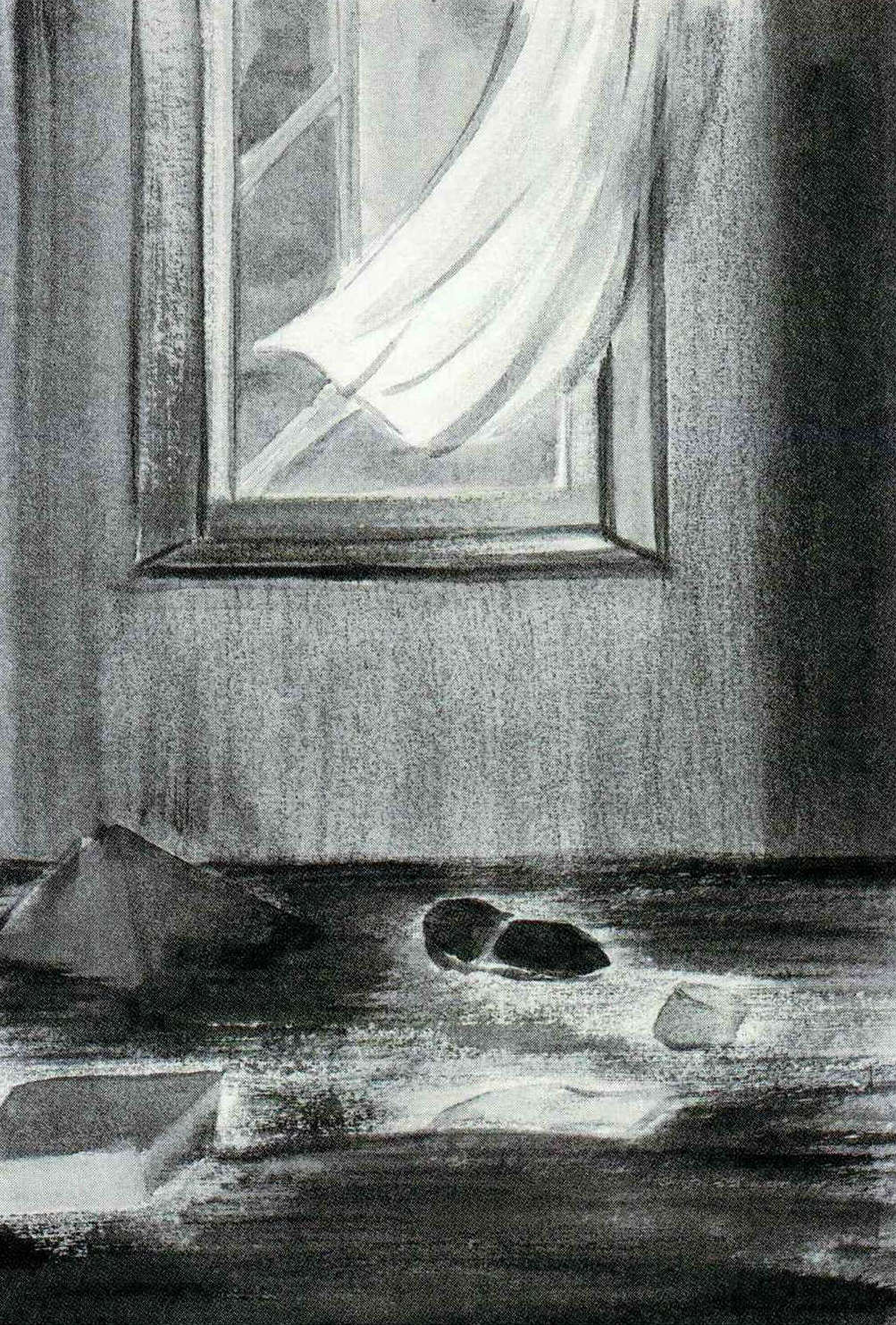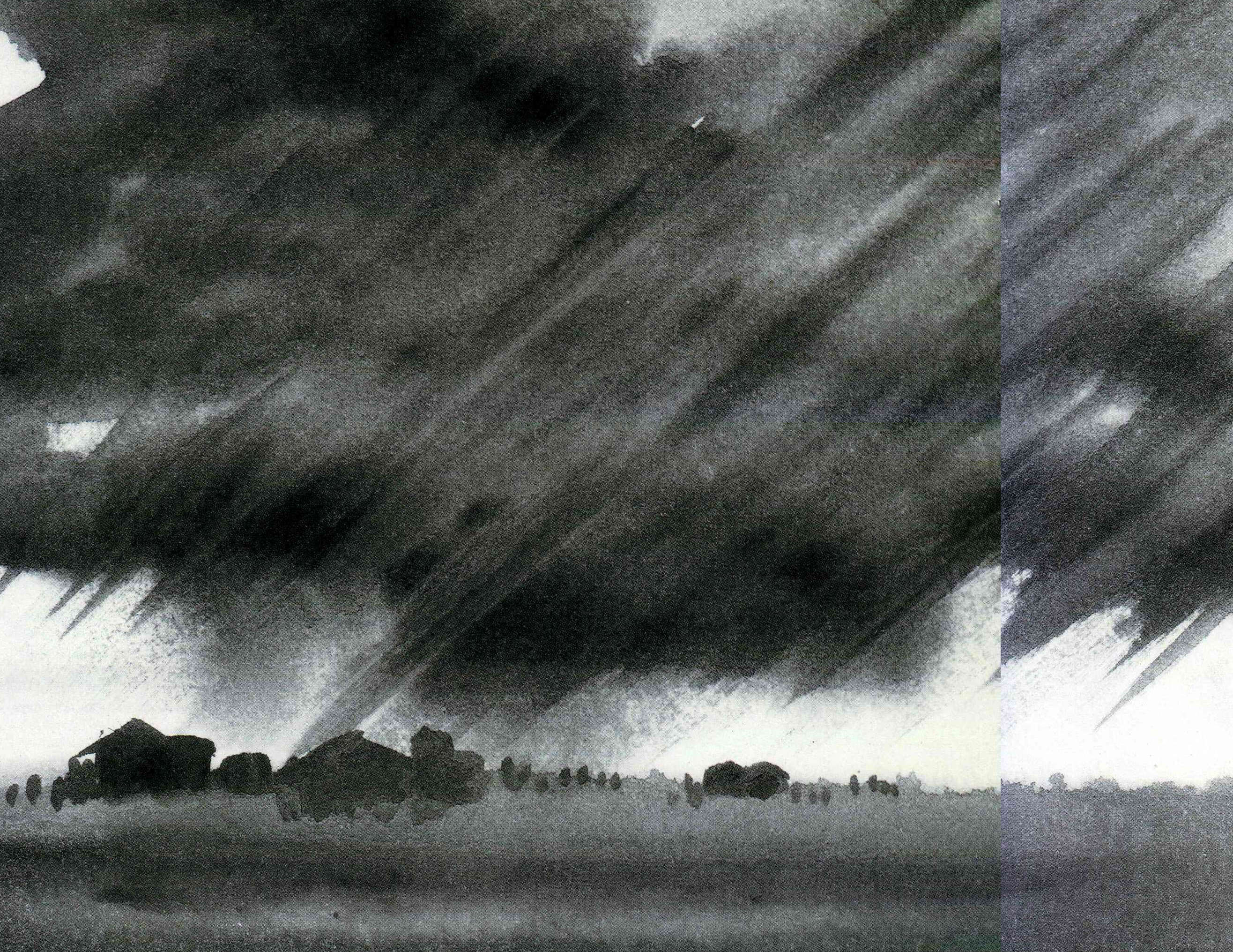暴風再次發揮強勁威力時,繪事已接近尾聲,年輕畫家背門而坐,自他的身後,我看見潮水從門縫底邊進來,風聲從尖嘯到轟鳴,房子裡的空氣迅速流動,碎裂玻璃的聲音此起彼落,當廚房通往走廊的門被風扯開,年輕畫家不得不終止繪事,想盡辦法堵塞房子裡的風洞,直至冷氣機飛脫,砸傷了年輕畫家的額角,戰況更急轉直下,滿屋裡翻飛著紙張、書本、衣服、樹葉和食物,水淹的速度很快,鍋盤杯碗和雜物,如飄流的河燈,泛著奇麗的色彩;薄門板讓風扯走,深如大海一樣的黑暗立刻進佔房子的下層。當我躺在年輕畫家濕冷的懷抱中,退至二層樓上的房間時,電源亦隨即中斷,四周黑墨墨,費好大的勁才漸漸辨清物事的輪廓,我們在黑暗中互相倚凭,使得在無助的境遇中,重新得到力量和希望,雖然驚濤和風雨就在身邊迴環往返,我仍然感覺得到熱血在皮膚下慢慢流過,並且看見年輕畫家擦傷了的額角,凝結著淤黑的血塊,蟄伏著如沙灘上灰黑的爬蟲。