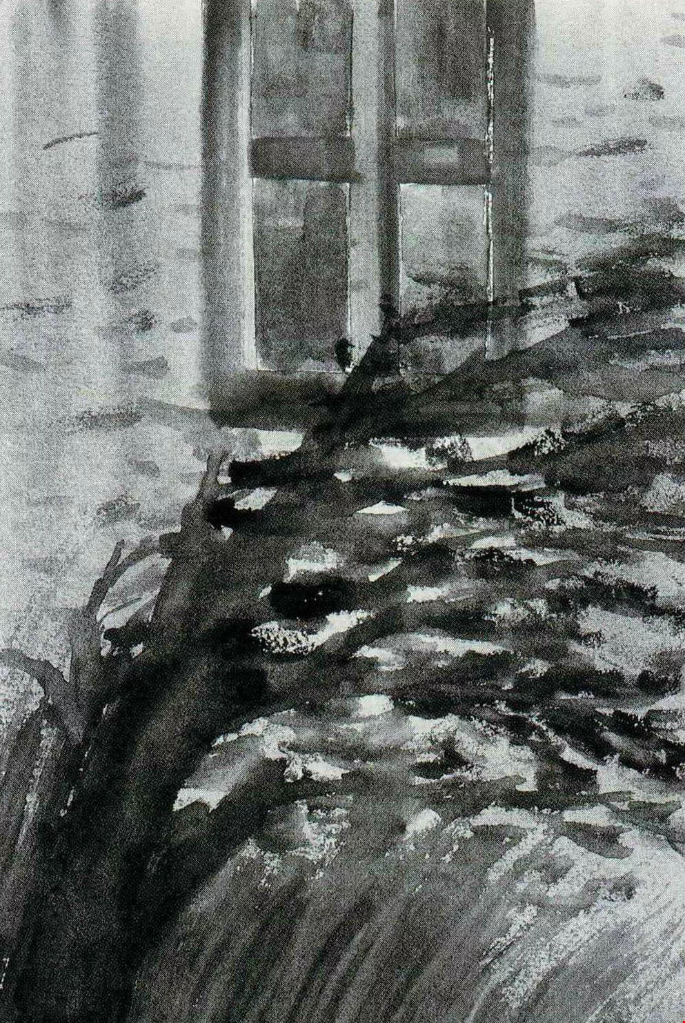 這房子就像渡船一樣,在巨浪中搖晃得厲害。黑暗中的事物仍有分別的層次,水已淹到樓梯的第四層,樓上的窗玻璃和牆壁不斷地流淚,粗壯的火鳳凰樹枝枒迎風折斷,插裂陽台上的玻璃門窗;巨浪一個個打了上來,房子彷彿航向大海似的;房間外風雨瀰漫,我與年輕畫家渾身濕透,獨坐無言;天花頂無情地淌水,如瀑布如小溪,落到我們的身前和身後;木板壁抵不了愈來愈強悍的風力,慢慢偏離了位置,向房間另一面緊壓過去,傾斜成七十度角;幾層樓高的浪頭撲打這所飄搖的房子,海水嘩嘩地散落下來。陽台崩塌下去的時候,潮水已漫上樓梯的頂端,板壁恰好傾斜成四十五度角,汪洋一片,分不清是雨水還是海水,反正全部一起灌進來了。