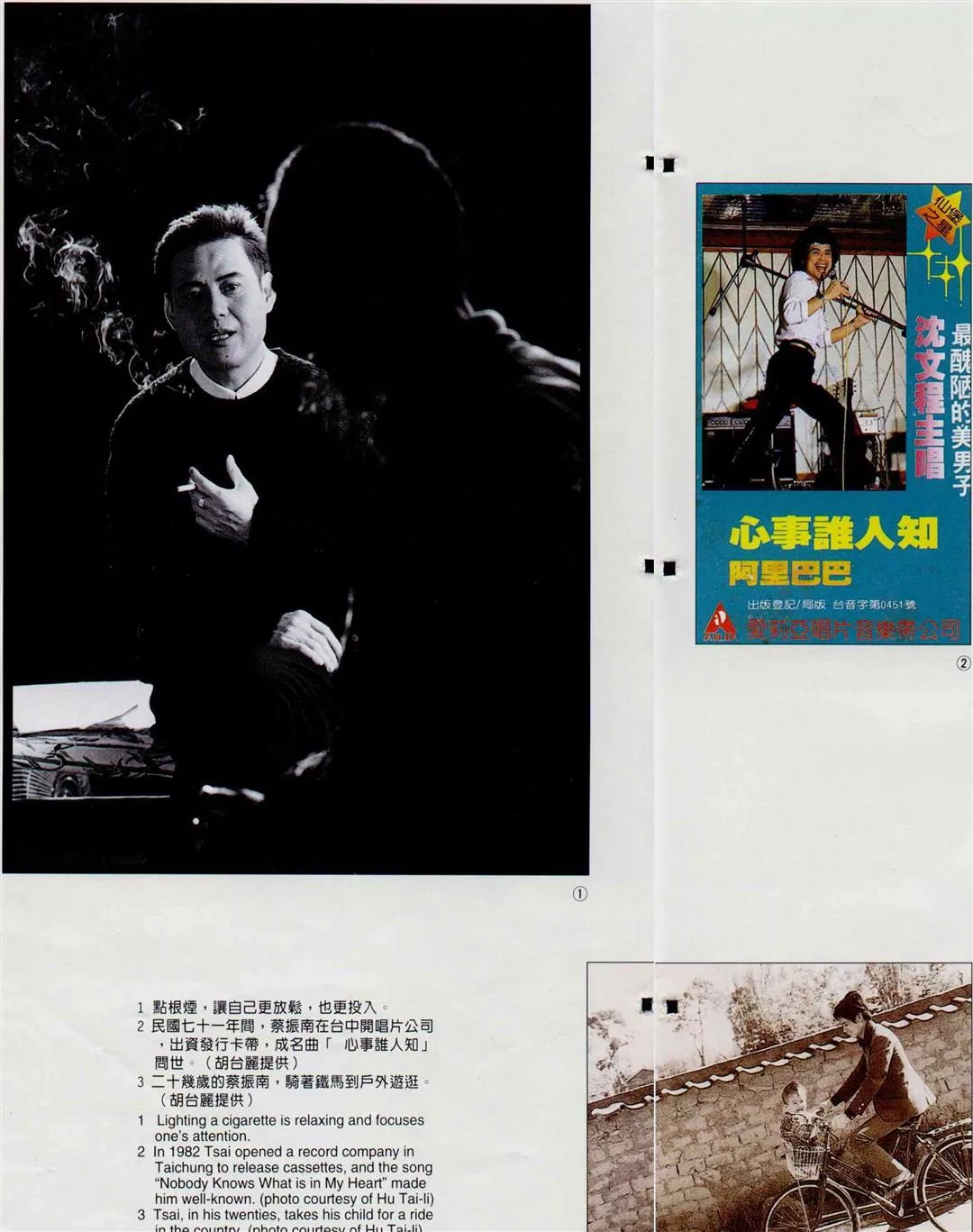 1. 點根煙,讓自己更放鬆,也更投入。 2. 民國七十一年間,蔡振南在台中開唱片公司,出資發行卡帶,成名曲「心事誰人知」問世。(胡台麗提供) 3. 二十幾歲的蔡振南,騎著鐵馬到戶外遊逛。(胡台麗提供)(胡台麗提供)