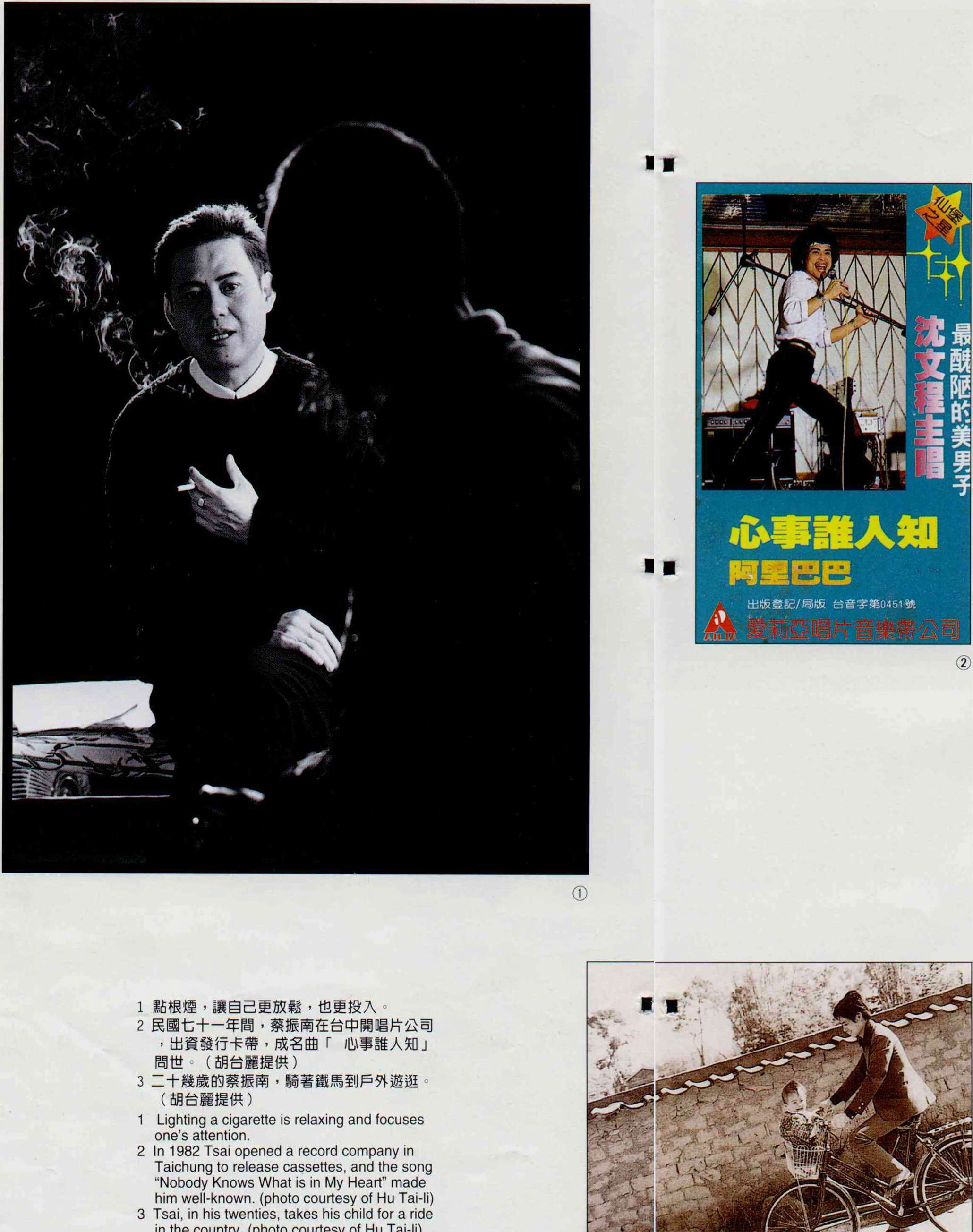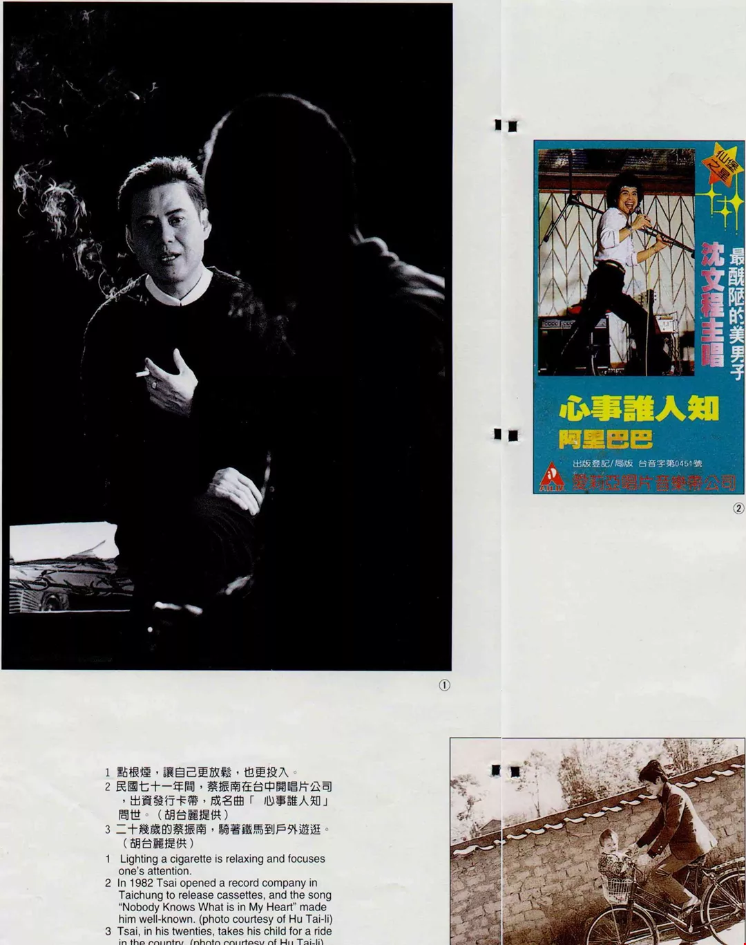1. 點根煙,讓自己更放鬆,也更投入。 2. 民國七十一年間,蔡振南在台中開唱片公司,出資發行卡帶,成名曲「心事誰人知」問世。(胡台麗提供) 3. 二十幾歲的蔡振南,騎著鐵馬到戶外遊逛。(胡台麗提供)