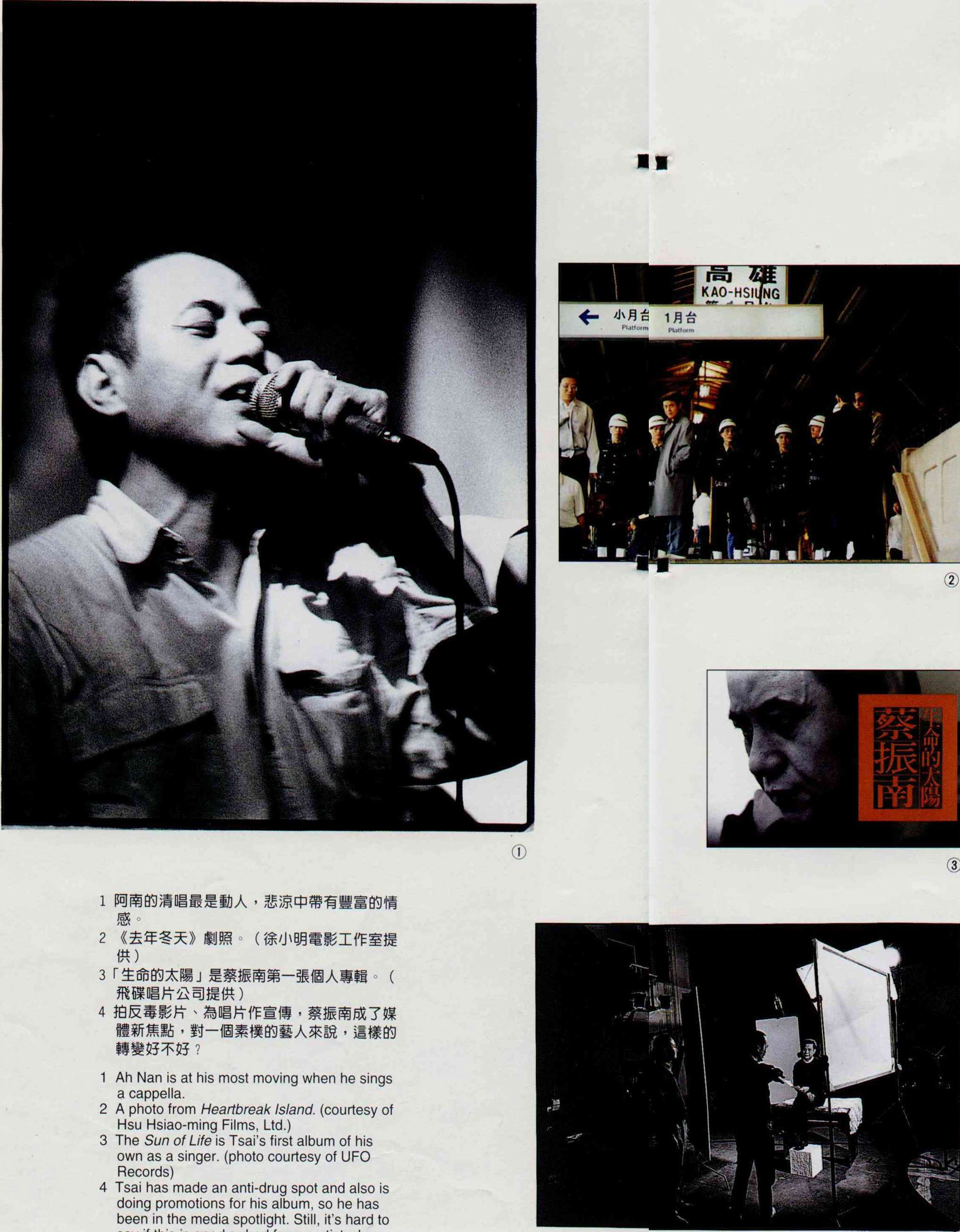 1. 阿南的清唱最是動人,悲涼中帶有豐富的情感。 2. 《去年冬天》劇照。(徐小明電影工作室提供) 3. 「生命的太陽」是蔡振南第一張個人專輯。(飛碟唱片公司提供) 4. 拍反毒影片、為唱片作宣傳,蔡振南成了媒體新焦點,對一個素樸的藝人來說,這樣的轉變好不好?(林盟山)