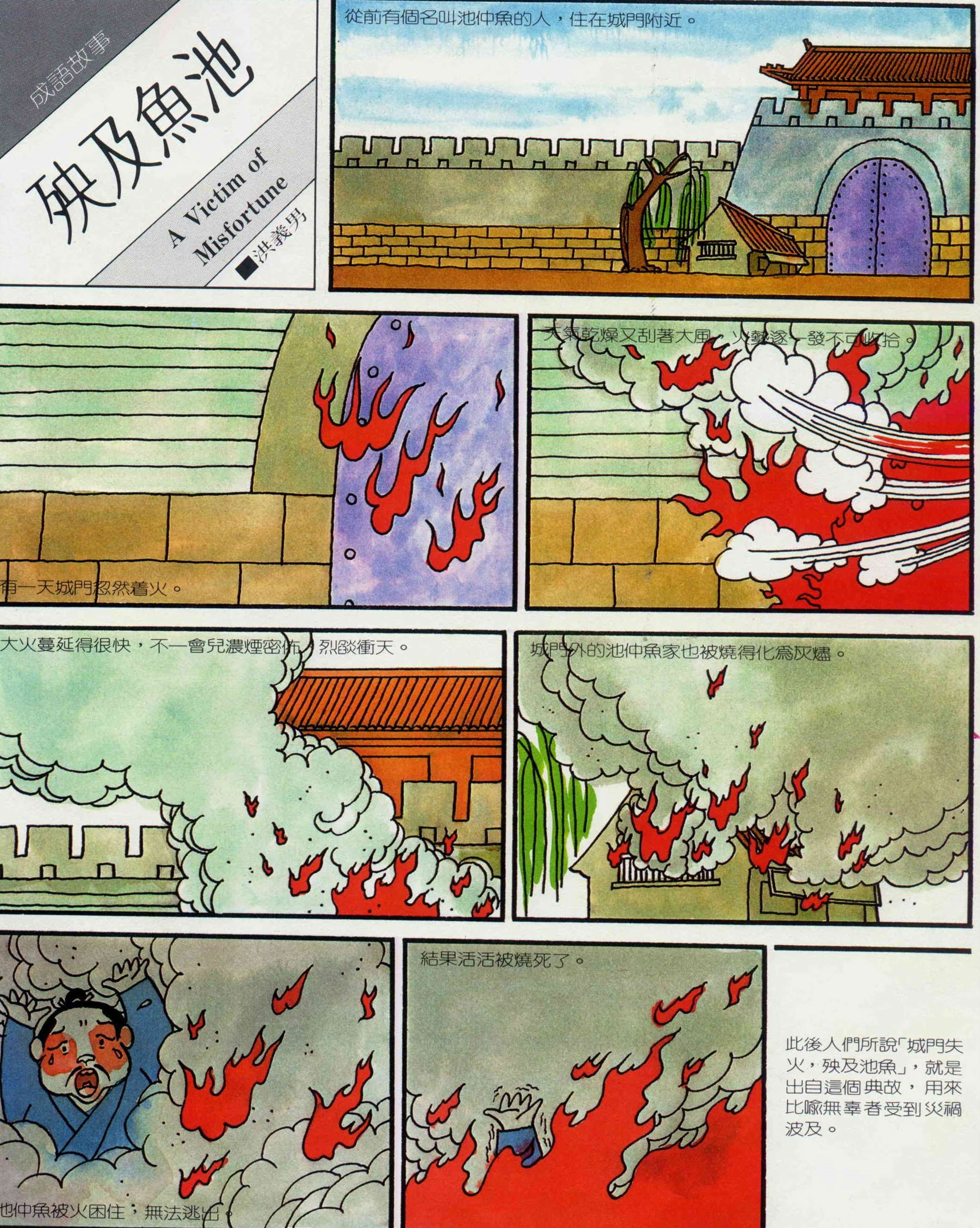 殃及魚池 文‧圖.洪義男 圖‧洪義男 1984 11月 EN 分享: 殃及魚池 ■洪義男從前有個名叫池仲魚的人,住在城門附近。有一天城門忽然著火。天氣乾燥又刮著大風,火勢遂一發不可收拾。大火蔓延得很快,不一會兒濃煙密佈,烈燄衝天。城門外的池仲魚家也被燒得化為灰燼。池仲魚被火困住,無法逃出。結果活活被燒死了。此後人們所說「城門失火,殃及池魚」,就是出自這個典故,用來比喻無辜者受到災禍波及。 從前有個名叫池仲魚的人,住在城門附近。 有一天城門忽然著火。 天氣乾燥又刮著大風,火勢遂一發不可收拾。 大火蔓延得很快,不一會兒濃煙密佈,烈燄衝天。 城門外的池仲魚家也被燒得化為灰燼。 池仲魚被火困住,無法逃出。 結果活活被燒死了。 此後人們所說「城門失火,殃及池魚」,就是出自這個典故,用來比喻無辜者受到災禍波及。 分享: