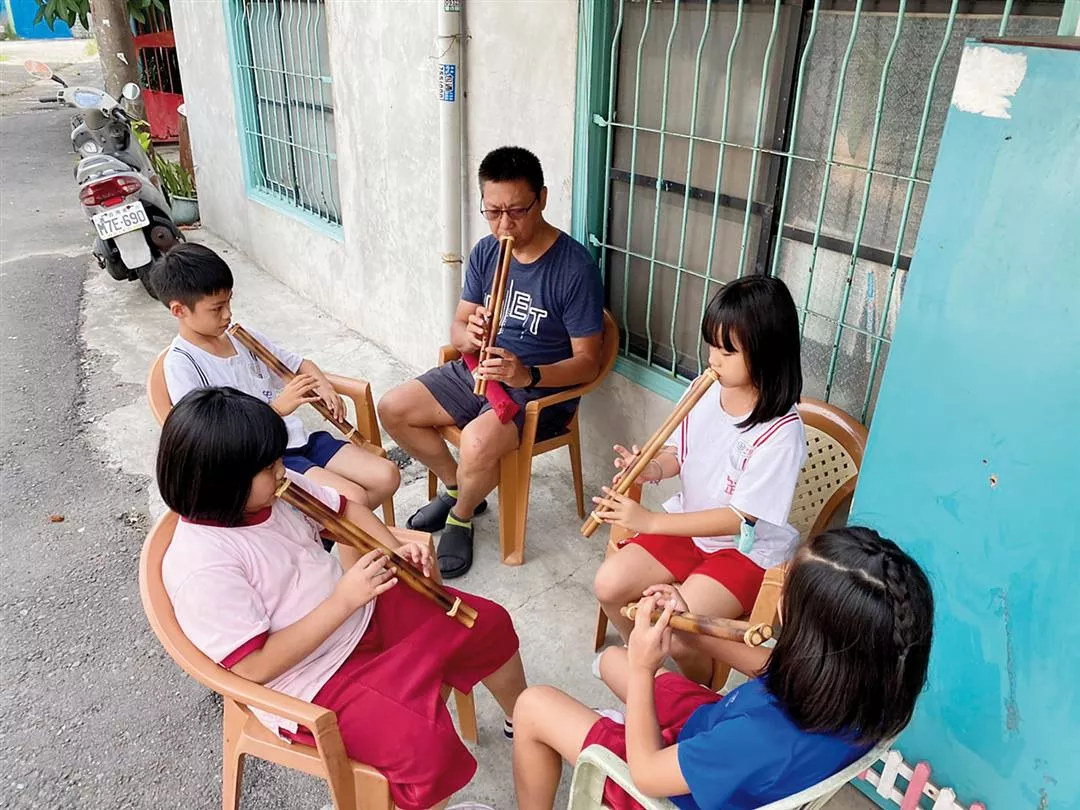 藝生余衛民在屏東大同教會免費的課輔班中,教小朋友吹奏口鼻笛。(余衛民提供)