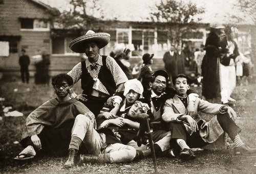 從小懂得體會中下階層勞動者辛勞的林之助(左二),就讀東京私立帝國美術學校時,在校慶活動裝扮大會上和同學穿戴成乞丐,意在諷刺上流社會一味追求金錢的醜態。