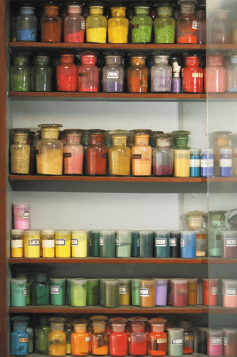 林之助畫室裡擺滿百餘種天然、化學、土質等各種顏料。