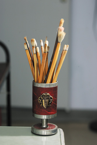 筆筒裡的各式畫筆,提供膠彩畫作所需。