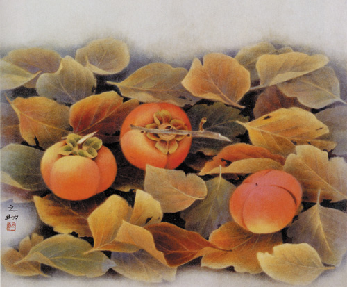 「水果作品的主題,我對視覺焦點所在的3顆紅柿,表現得十分細緻。畫面中落葉的色彩與角度是為了襯托主題,不能太強烈也不能太弱勢。葉子的質感比較粗糙,所以我會在葉面上加入一些礦物質來呈現;葉與葉的交疊,也就是橫線與直線的交叉,會產生空間感;至於陰影部分的色彩反差表現,一般人以為要表現暗,就是加黑色,但我不用黑色,因為陽光下沒有黑色,只有深色……。」