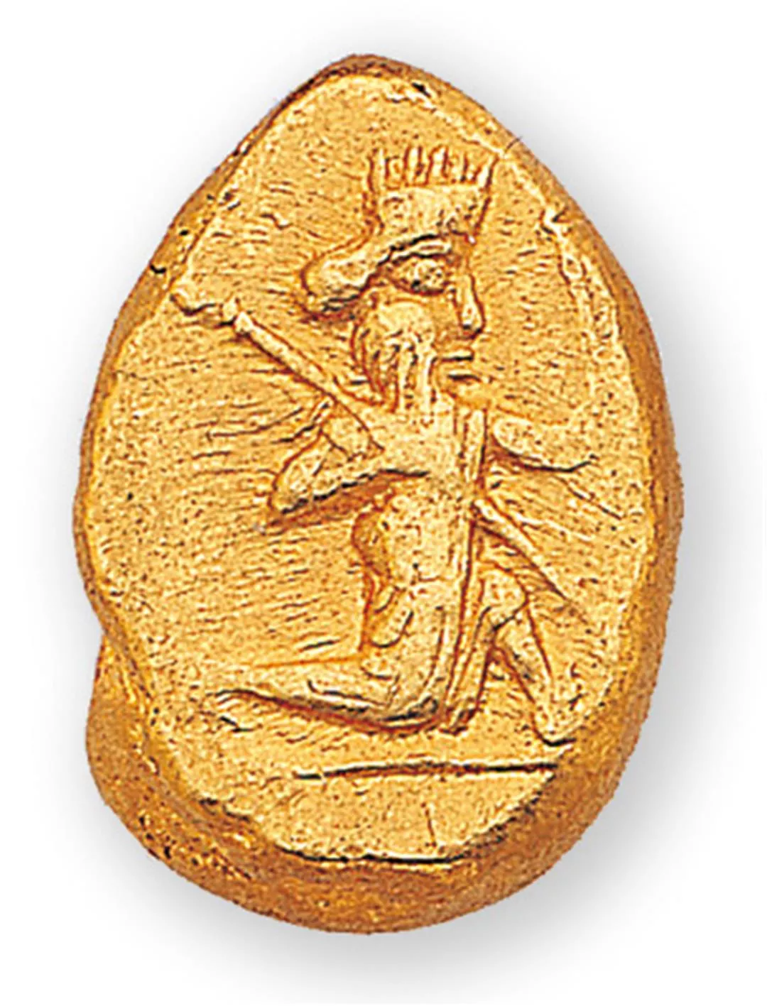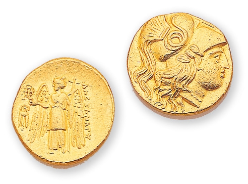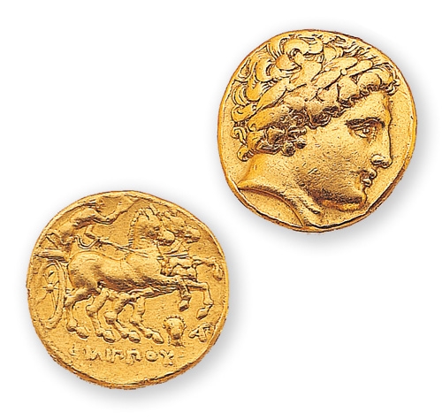 此為亞歷山大之父腓力二世,慶祝他在西元前356年贏得奧林匹克戰車競賽勝利所鑄造的「腓力佩歐」金幣。金幣正面(右)是宙斯神像,背面是駕馭戰車圖。金幣直徑為18mm,重量為8.5克。