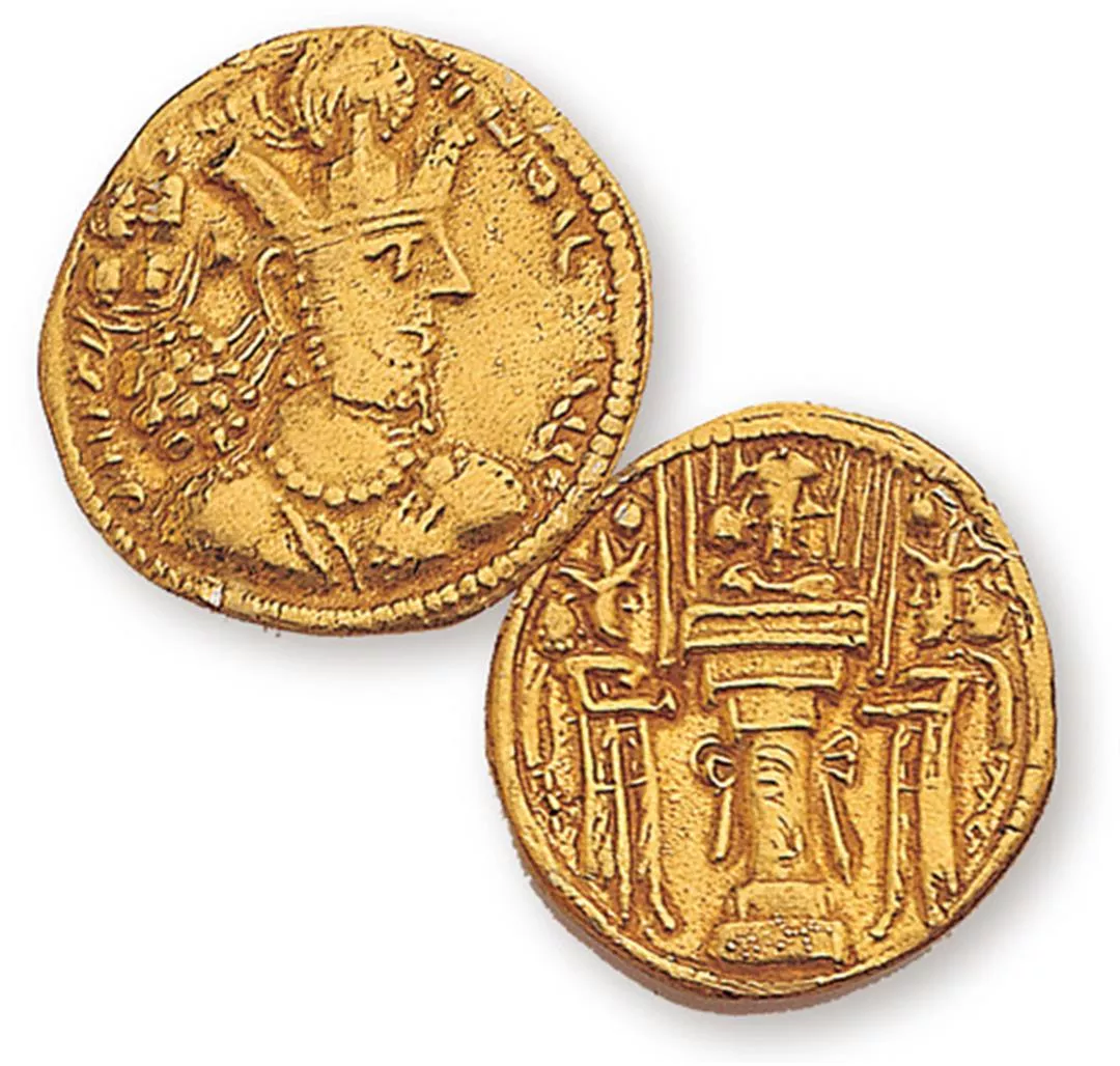 這是波斯「薩珊」王朝的金幣。薩珊銀幣和拜占庭金幣齊名,但金幣數量稀少,金幣正面照例是君主像,背面則是拜火教的祭壇。