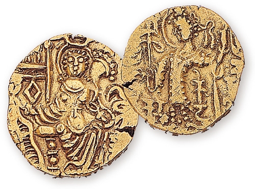 西元紀年之初,西有羅馬帝國和安息帝國征戰不休,東有大漢帝國天威赫赫,絲路沿線的「貴霜王國」也不能小覷。貴霜採金本位制,《後漢書》以「最為富盛」讚嘆它。其金幣「第納爾」有濃濃的天竺味,正面(右)刻國王像,另一面則為大自在天「濕婆神」。