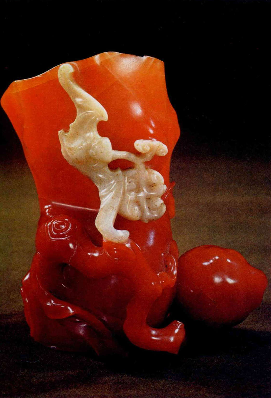 未雕刻之前,這整塊瑪瑙就有紅、白兩色,如果被一個功夫不到家的玉工得到,他可能會把那小小的白色部分去掉。但這位高明的玉工,卻利用這塊白色部分,雕成一隻白蝙蝠,和蟠桃相配,含義深遠,堪稱「巧作」。