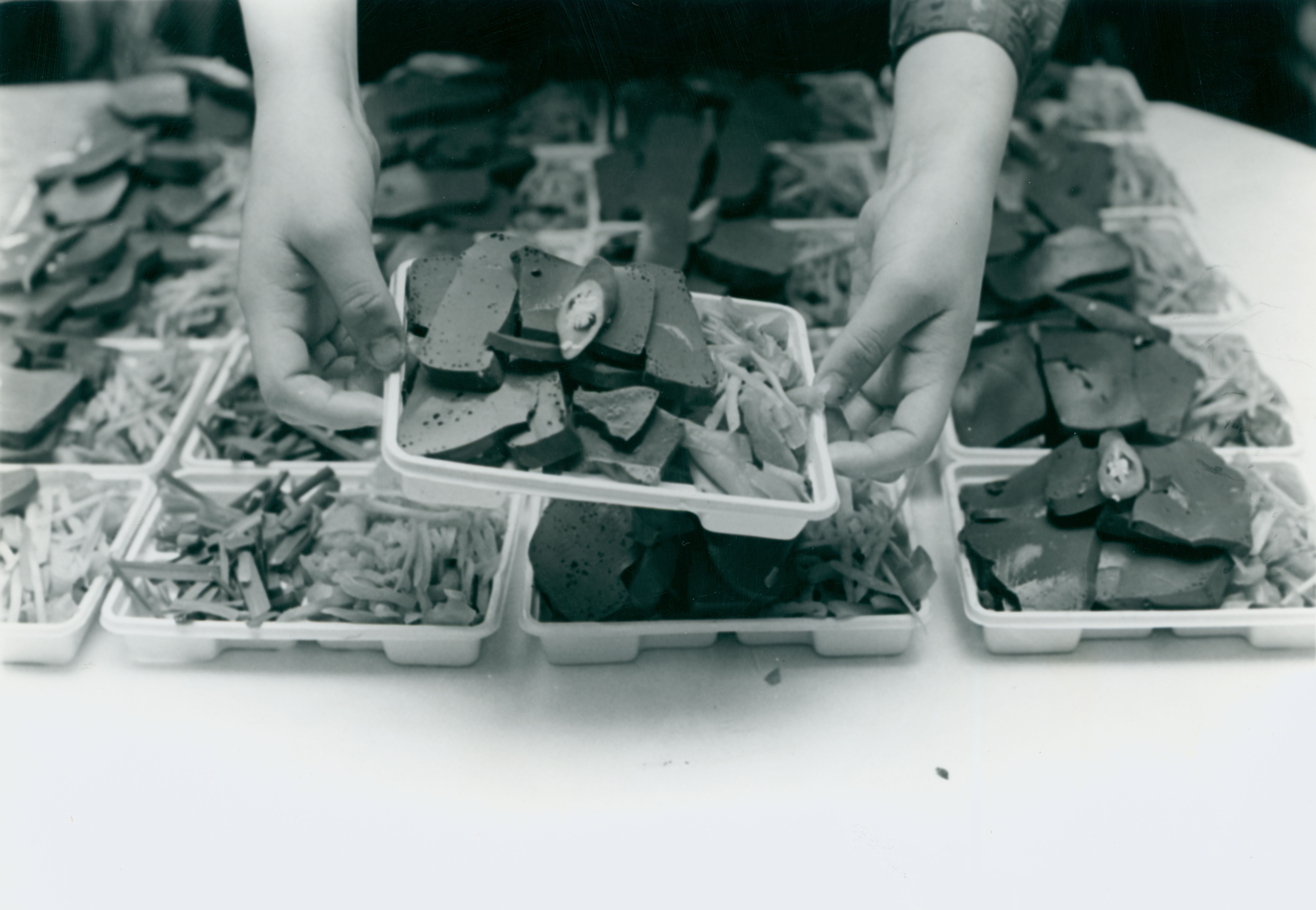 上午七點多,「南門」的十一位員工就進入「備戰」狀態。雖然某些該煮至七、八分熟的材料,如紅豆、綠豆、鴨肉、肚片……,前一天晚上已完成,但是還要忙洗菜、切菜、配置與包裝,然後趕在上午十點以前,把配好的菜盒送往各超級市場。
